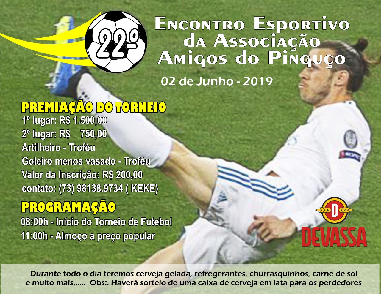 Associação Amigos do Pinguço realiza no próximo dia 02 de junho o 22º Encontro Esportivo, com almoço a preço popular, premiação do torneio, para 1º lugar (R$ 1.500,00), 2º lugar (R$ 750,00), goleiro menos vasado (Troféu), e Artilheiro (troféu).