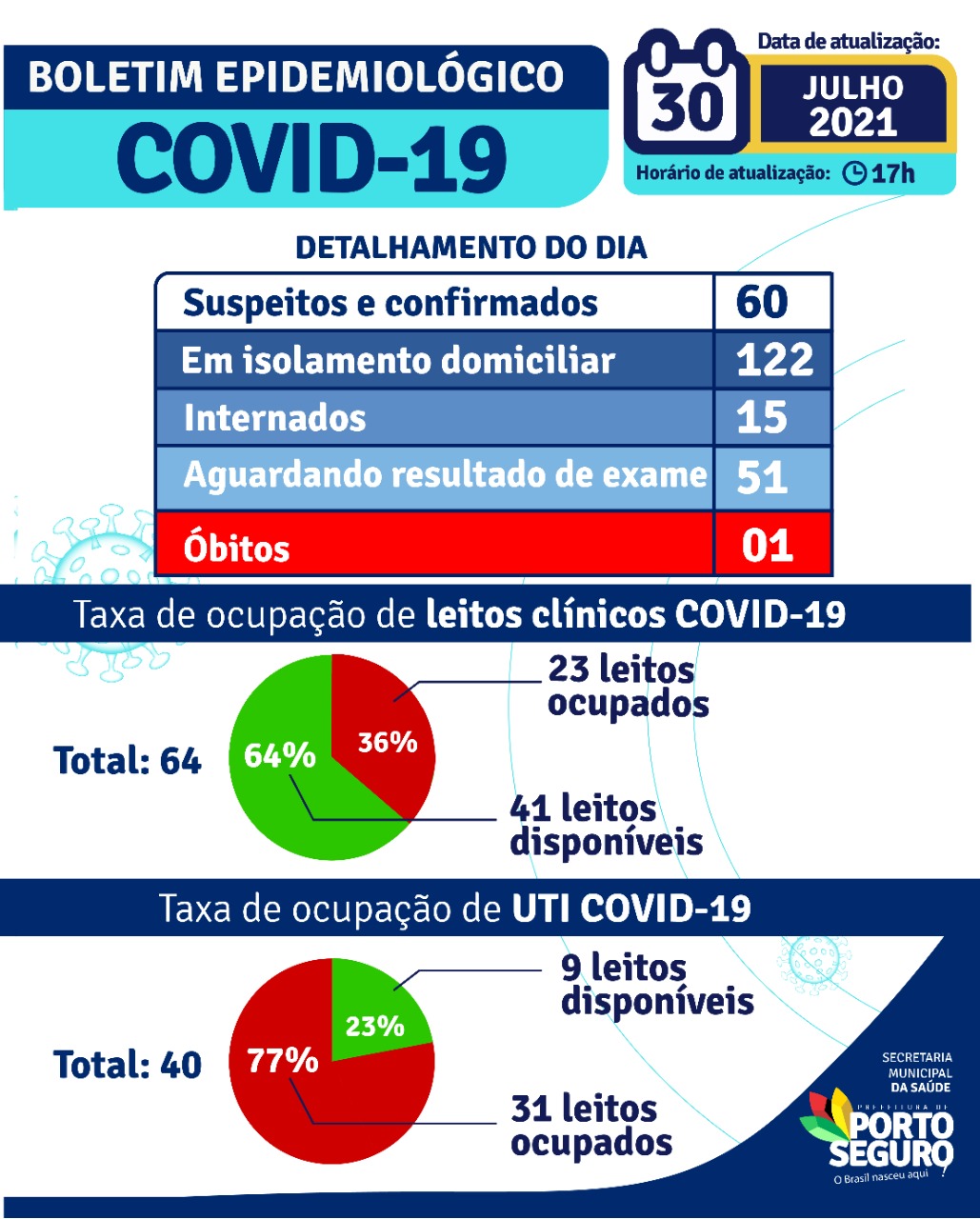 A Prefeitura de Porto Seguro, através da Secretaria Municipal de Saúde, informa que no período de 14/03/2020 a 30/07/2021, foram 23.673 casos de COVID-19, sendo 10.876 confirmados e 12.797 suspeitos, classificados de acordo com a sintomatologia clínica.