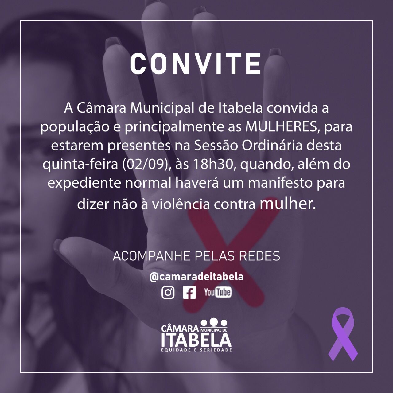 A vereadora Simone Sossai convoca todas as mulheres Itabelense que compareçam à reunião da câmara de vereadores nesta quinta-feira 02 setembros as 18:30 h. Para um manifesto contra à violência com a mulher!