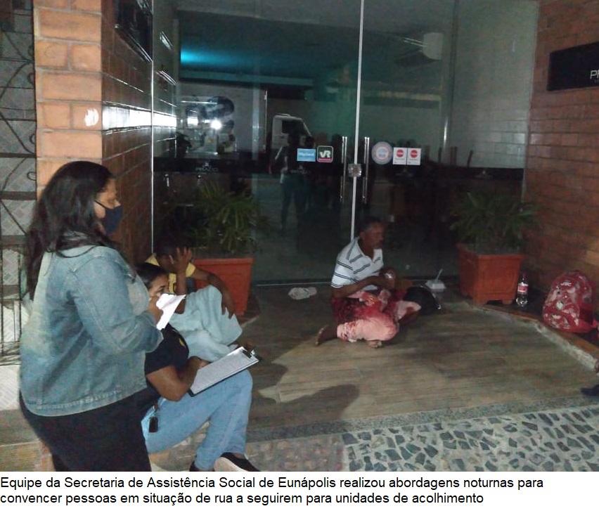 Equipes da Secretaria de Assistência Social de Eunápolis estão reforçando as ações de abordagem a pessoas em situação de rua no município. As atuações são realizadas durante a noite e de madrugada, na tentativa de convencer as pessoas a seguirem para as unidades de acolhimento disponíveis na cidade.