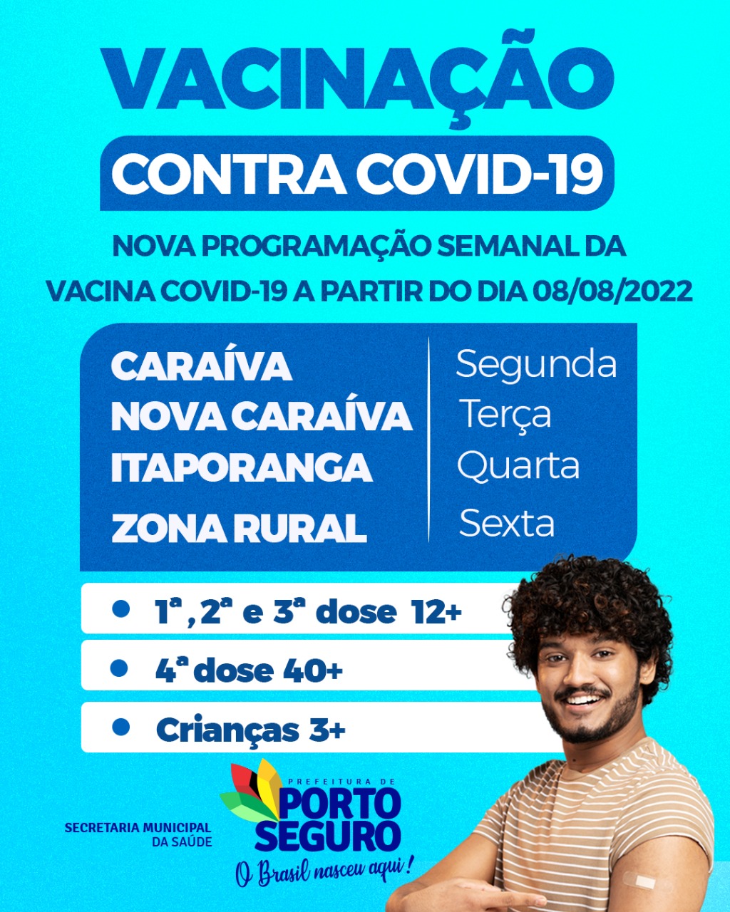 A vacinação contra a COVID-19 estará suspensa a partir do dia 01/08/2022 nos seguintes locais, fique atento a nova programação semanal e fique protegido.