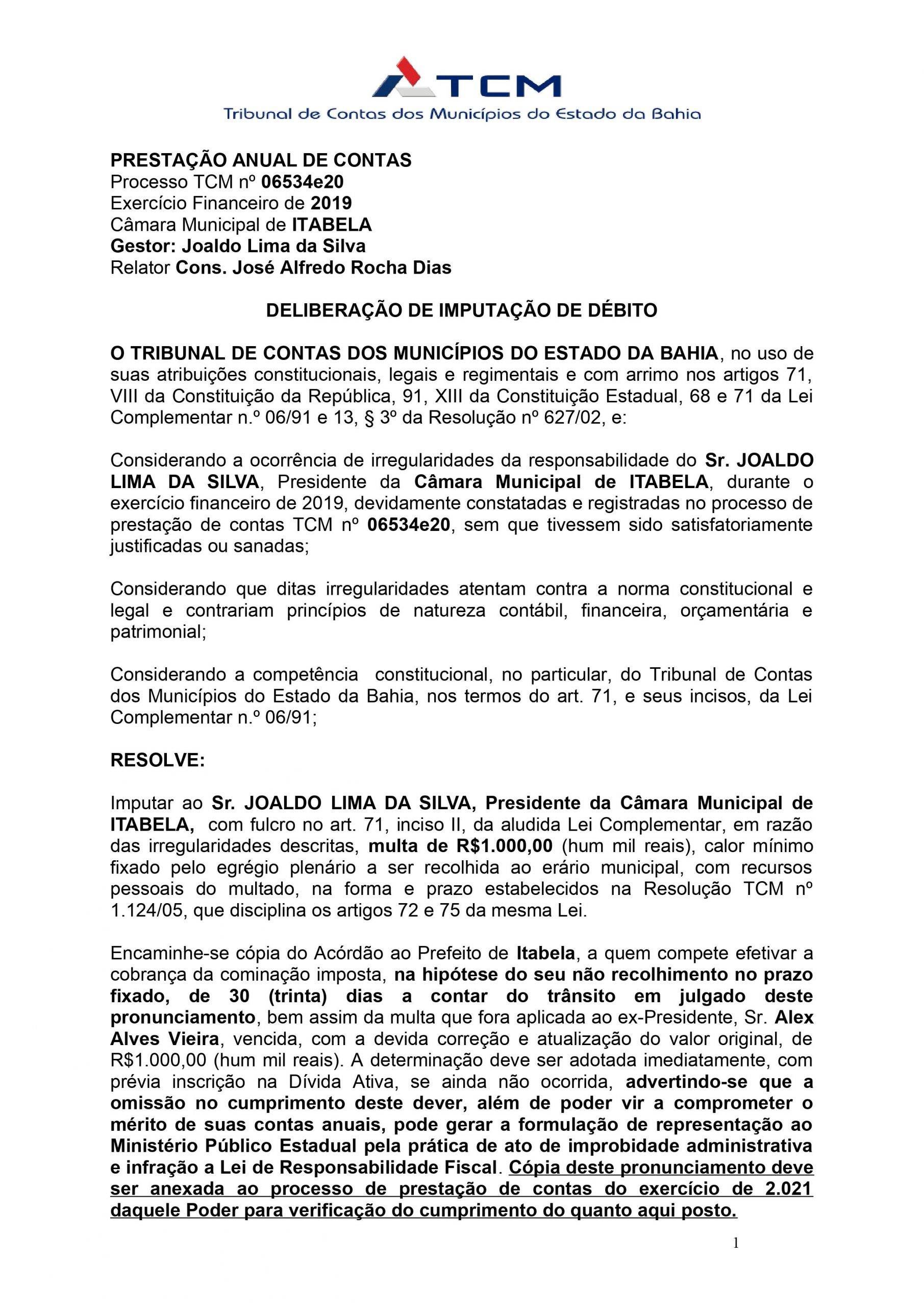 O vereador e presidente de câmara de Itabela, Joaldo Lima da Silva, é multado em R$ 1.000,00 (Hum mil reais) pelo TCM, referente ao exercício 2019.