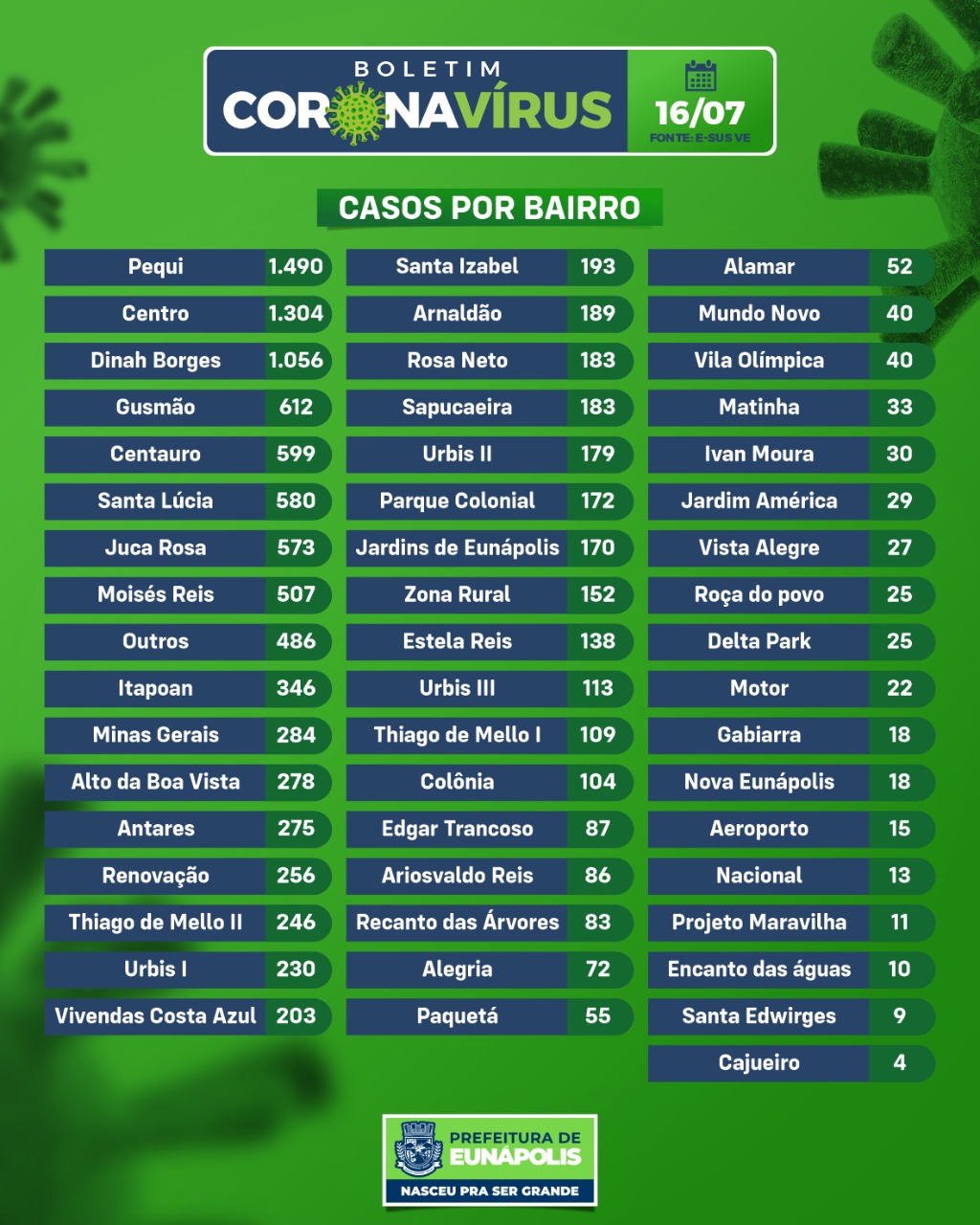 O município tem hoje 12.014 pacientes confirmados com o novo coronavírus, sendo já recuperados, 232 ativos (casos confirmados subtraídos os óbitos e os recuperados) e 204 óbitos. O município segue com 06 óbitos sob investigação.