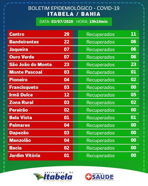 Itabela registra, em 03/07/2020, 130 casos confirmados do novo coronavírus (COVID-19), dos quais 63 pacientes já se encontram curados, 06 internados, 01 óbito, 22 aguardando resultado do LACEN-BA e 204 em Monitoramento.