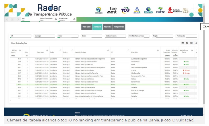 A Câmara Municipal de Vereadores de Itabela se destaca entre os poderes legislativos da Bahia ao conquistar o 10º lugar no ranking de transparência pública. Com um índice impressionante de 67,80%, essa conquista é um marco para a região da Costa do Descobrimento e Extremo Sul da Bahia. O salto significativo de 38,36% na avaliação em comparação ao ano anterior é notável e reflete o compromisso em promover a transparência.