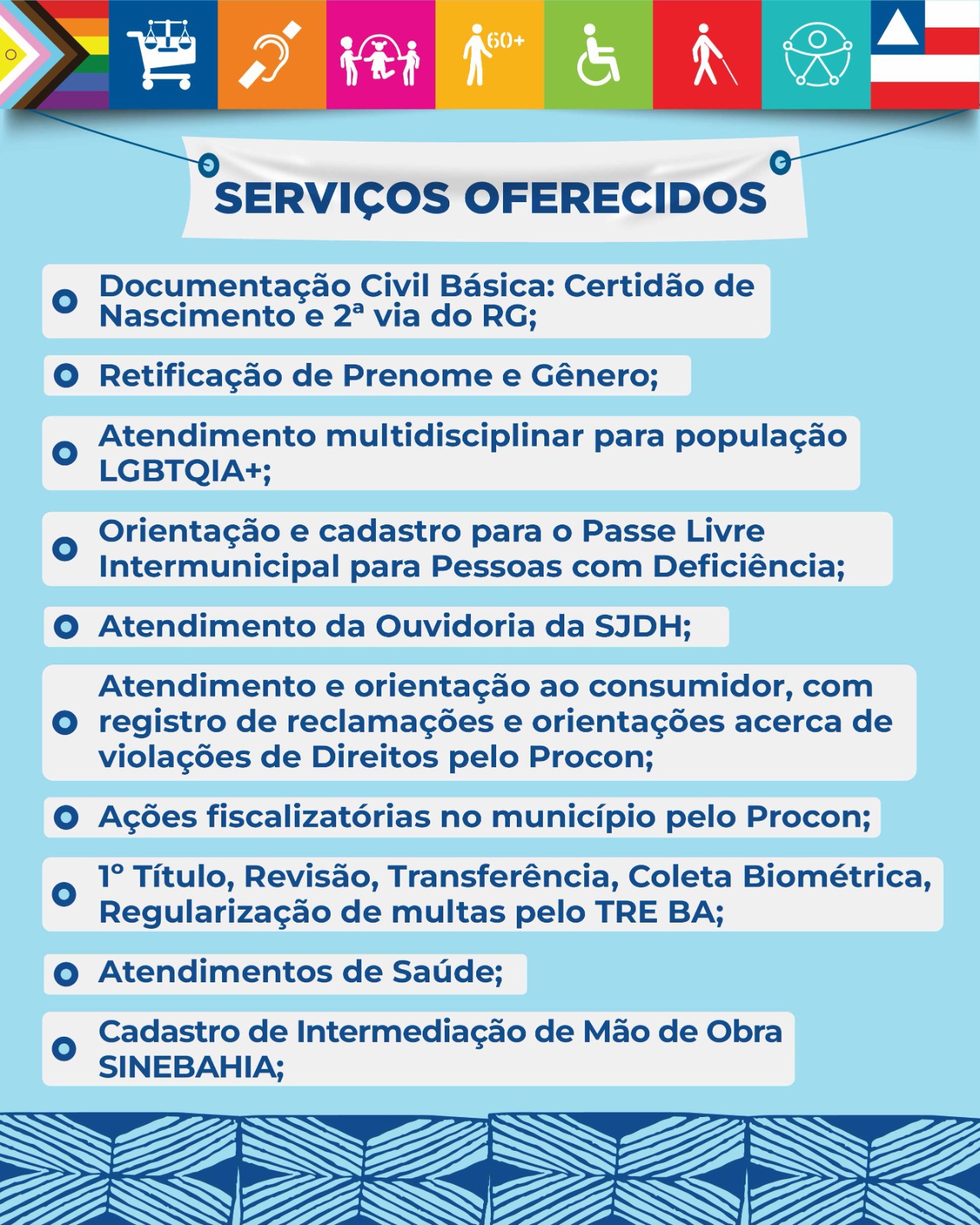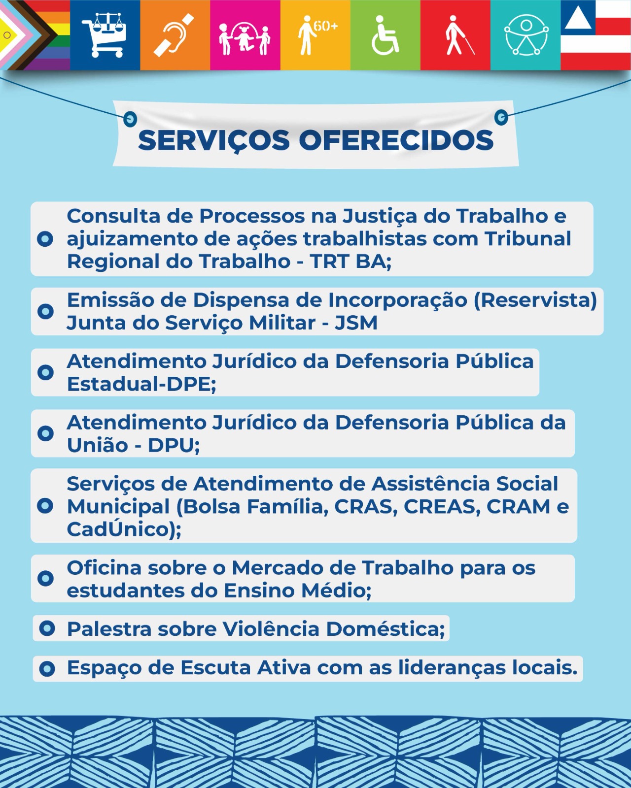 De acordo com o secretário de Governo, Claudio Soares, entre os serviços ofertados estão: atendimentos de saúde e assistência social, como Bolsa Família, CRAS, CREAS, CRAM e CadÚnico; 1º Título Eleitoral, transferência, coleta biométrica e regularização de multas junto ao TRE; atendimento jurídico da Defensoria Pública e consultas a processos trabalhistas; cadastro e intermediação de mão de obra Sinebahia, Escuta Ativa com lideranças locais, entre outros.