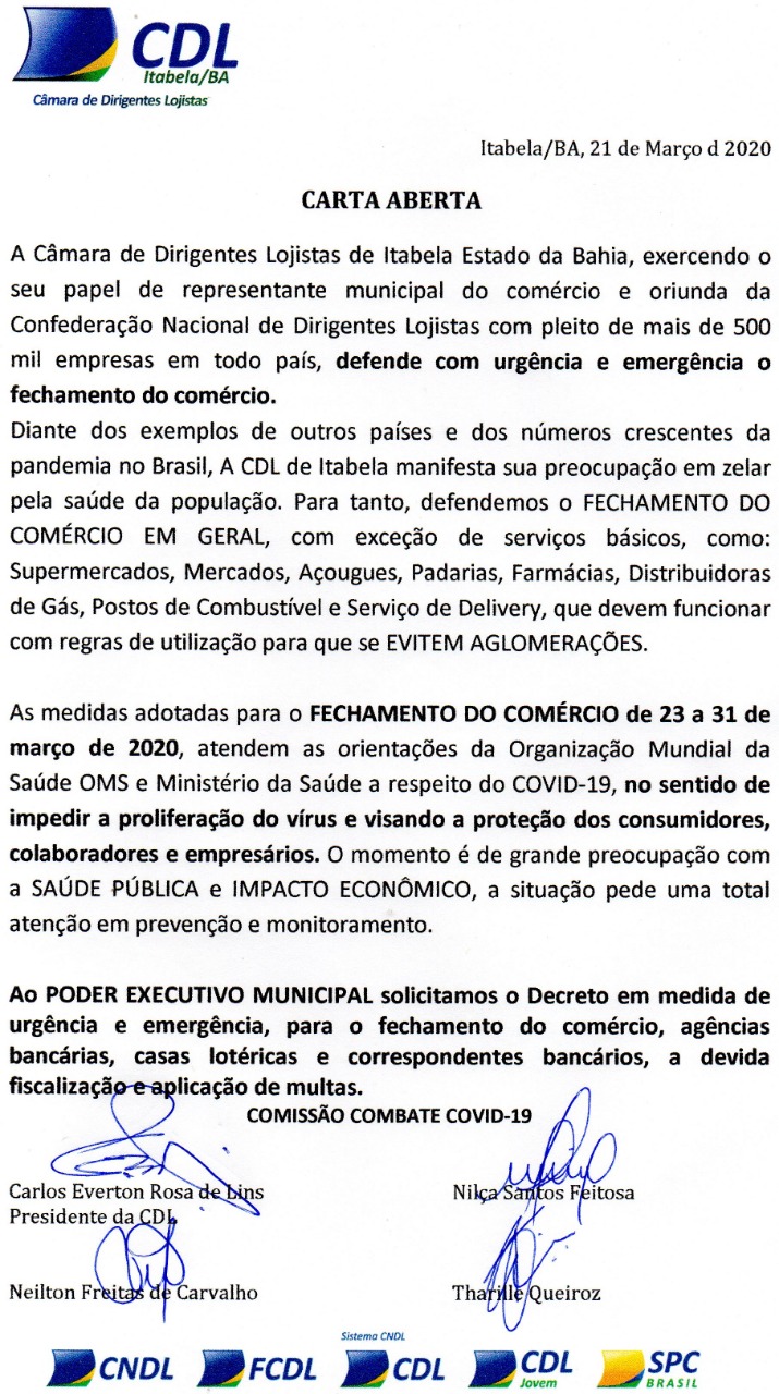 A CDL – Câmara de Dirigentes Lojistas de Itabela Estado da Bahia, exercendo o seu papel de representante municipal do comércio, defende com urgência e emergência o fechamento do comércio.