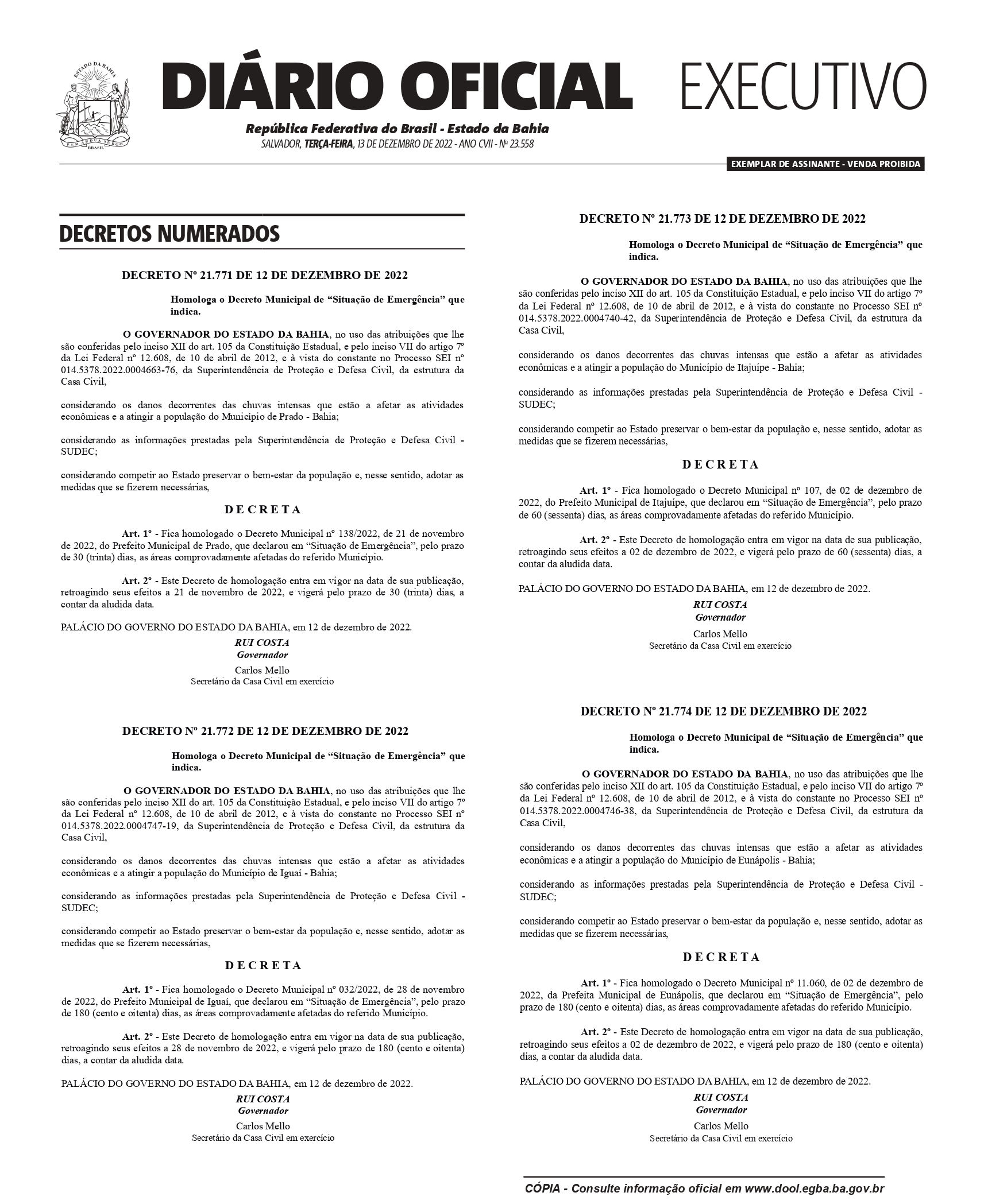 A situação de emergência de Eunápolis, decretada pela prefeita Cordélia Torres, foi reconhecida pelo Governo da Bahia por meio do decreto n° 21.774, publicado do Diário Oficial do Estado na segunda-feira (12).