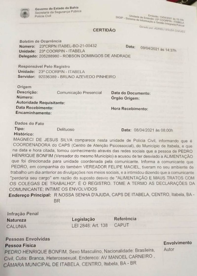 A Coordenadora do Centro de Atenção Psicossocial (CAPS), Magneci de Jesus Silva, registrou um boletim de ocorrência contra o Vereador Pedro Henrique Bonfim, após ter sido acusada de ter desviado alimento da instituição e de perseguição aos seus colegas de trabalho.