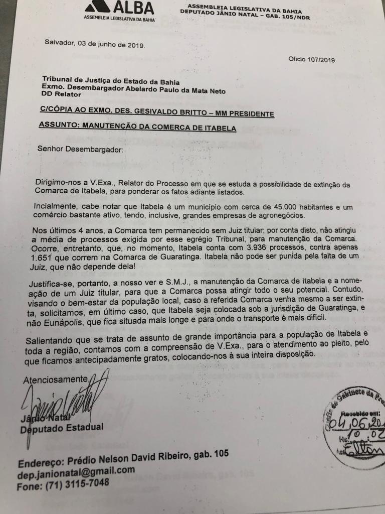 A notícia de que a comarca de Itabela corre um sério risco de ter as suas atividades encerradas, o Deputado Estadual Jânio Natal (PODEMOS)emitiu um oficio aos desembargadores Gesivaldo Britto (Presidente do Tribunal de Justiça da Bahia) e Abelardo Paulo da Mata Neto (Relator do processo), solicitando a sua manutenção.