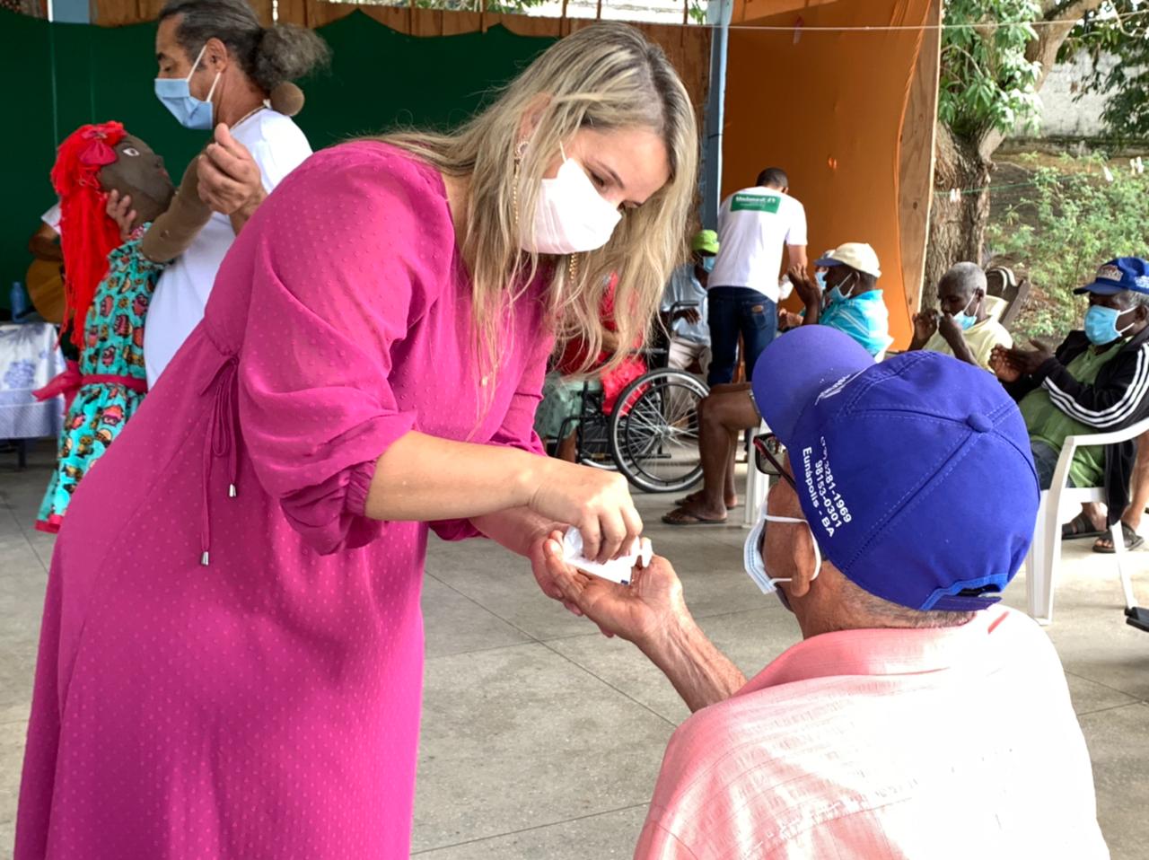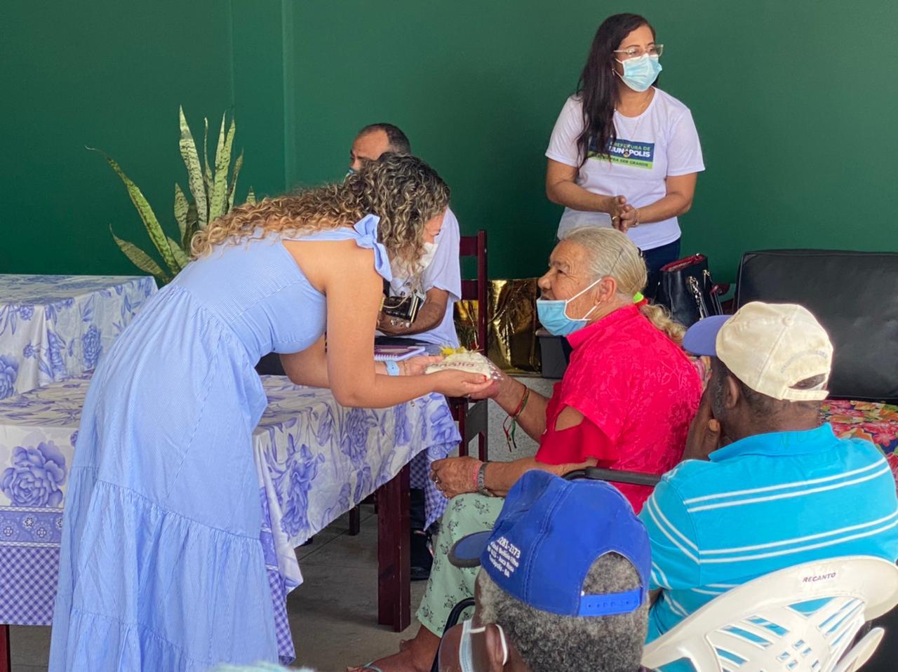Prefeita Cordélia entrega pedaço de bolo para idosa no Dia dos Avós