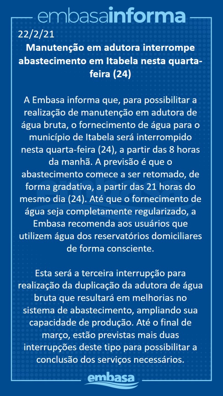 Abastecimento de água será suspenso nesta quarta-feira (24) em Itabela para manutenção em adutora da Embasa