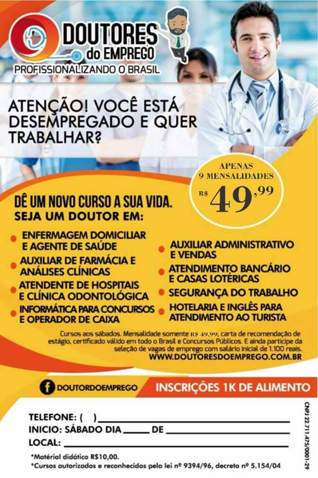 Enfermagem domiciliar, Agente de Saúde, Auxiliar de farmácia, Analise Clinicas, atendentes de Hospitais clinicam odontológicas, Informática para Concurso, Operador de Caixa, Auxiliar Administrativo, Vendas, Atendimento bancário e casas lotéricas, Segurança do trabalho, Hotelaria e inglês para Atendimento ao Turista.