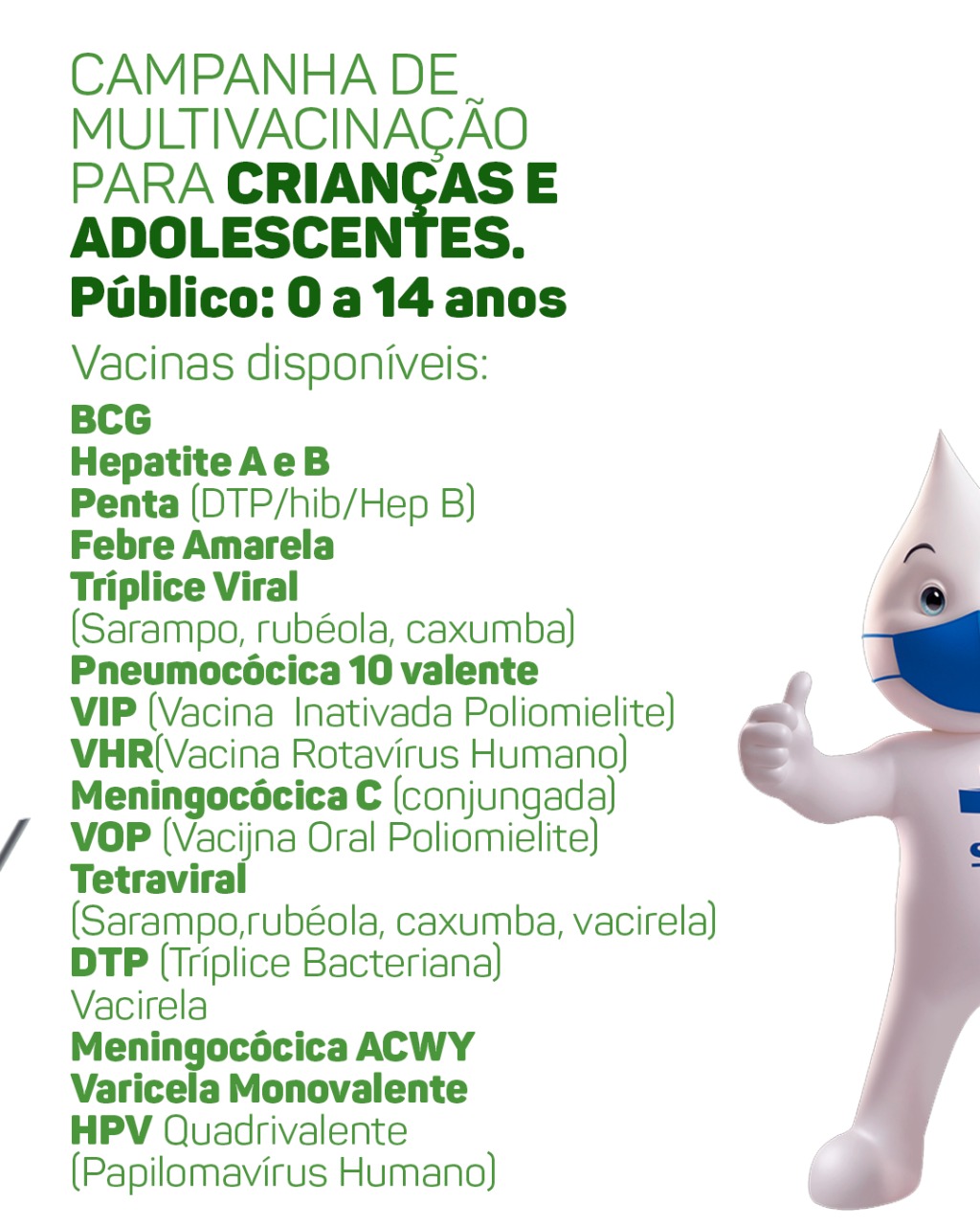 As vacinas disponíveis são: BCG, hepatites A e B, penta, febre amarela, tríplice viral, VIP, VHR, pneumocócita 10 valente, tetraviral, DTP, varicela monovalente, HPV, varicela monovalente, meningoncócita ACWY e VOP.