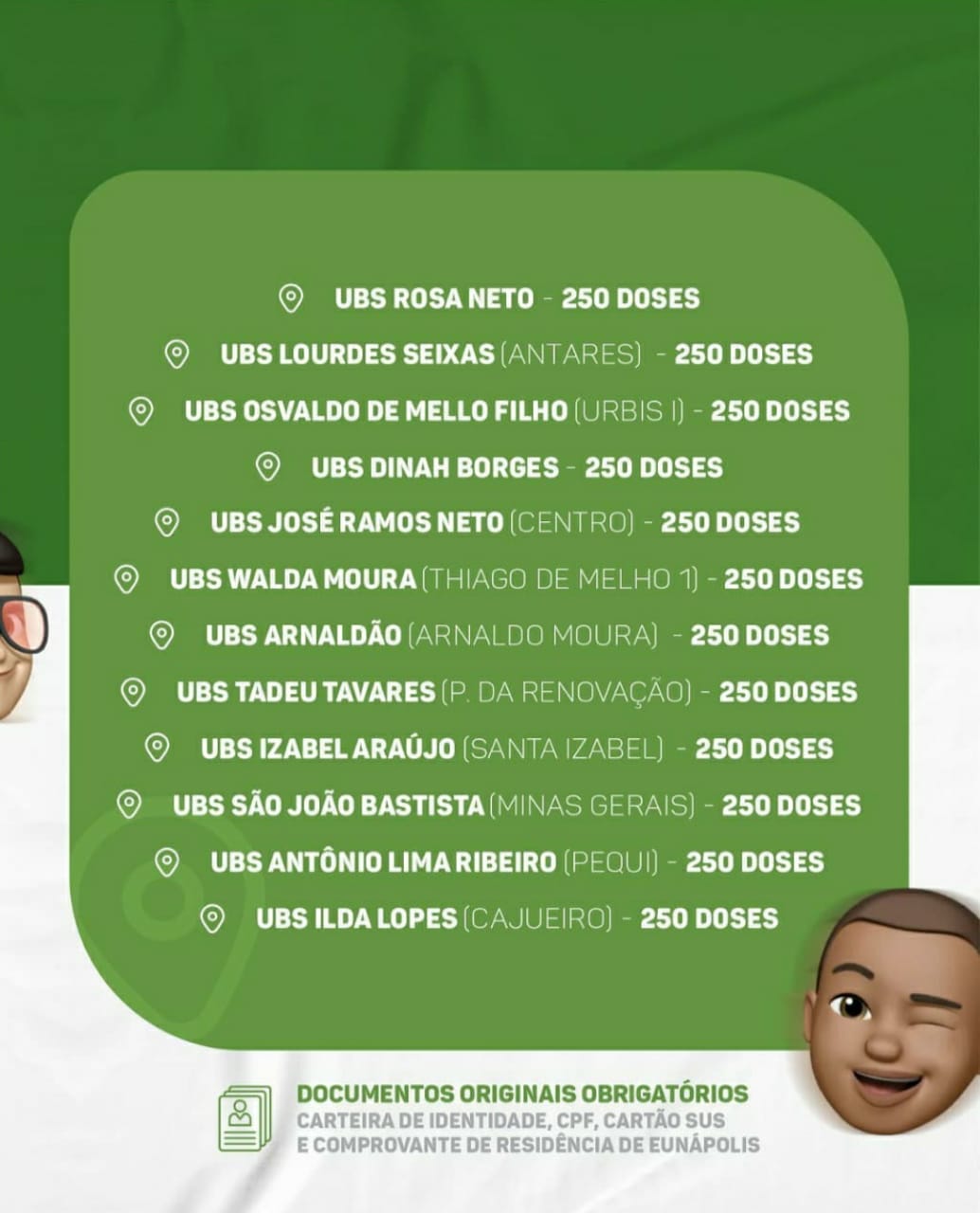 É obrigatória a apresentação de RG, CPF, cartão SUS e comprovante de residência de Eunápolis para receber a vacina contra a Covid-19.