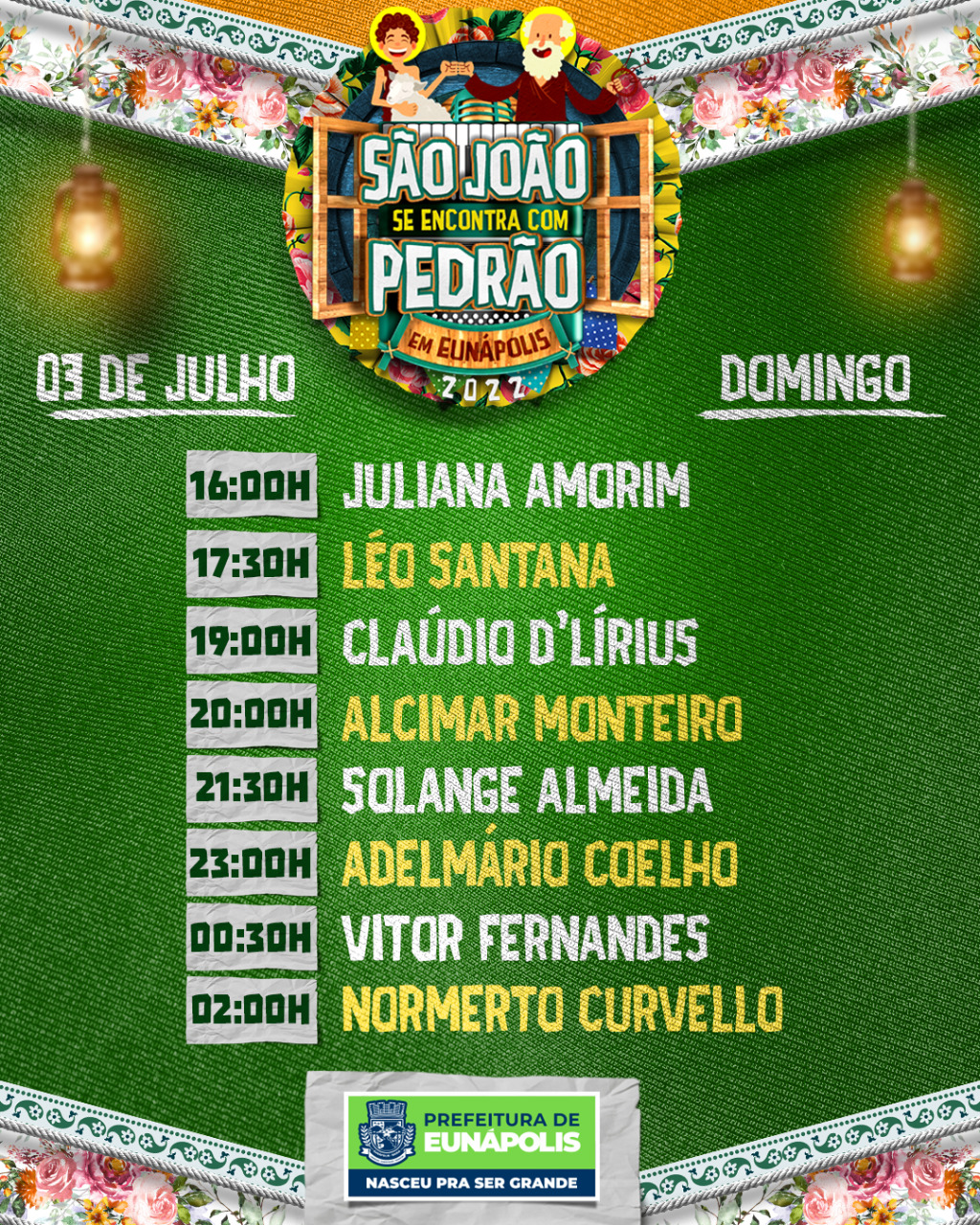 Ás atrações de hoje, 16h Julíana Amorim, 17:30 Léo Santana, 19h Caúdio D’lirius, 20h Alcimar Monteiro, 21:30 Solange Almeida, 23:00 Adelmário Coelho, 00: 30 Vitor Fernades e 2:30 Normentor Curvello.
