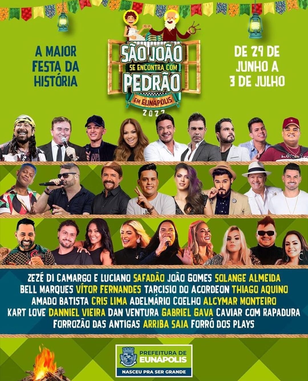 De acordo com a Prefeitura, “os investimentos para os festejos juninos são compensados com o incremento na receita municipal. E a gestão não está medindo esforços na infraestrutura necessária para estes grandiosos eventos, que além de promoverem a diversão à população local e turistas gratuitamente e fomento às nossas manifestações culturais, também geram emprego e renda para os eunapolitanos”.