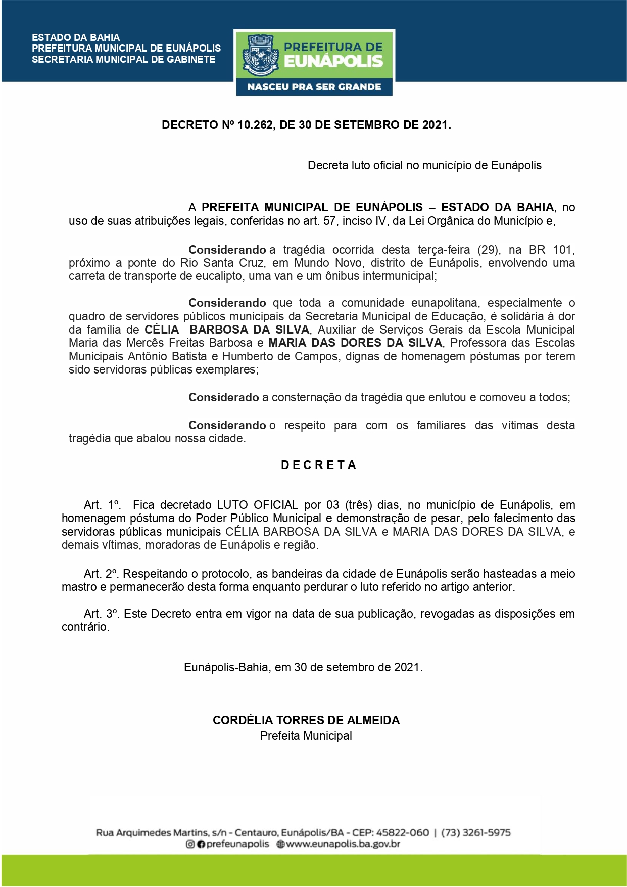 Em vista da tragédia, o governo municipal decreta luto oficial de 03 (três) dias – Decreto Nº10.262 – e se une a toda comunidade eunapolitana em solidariedade, neste momento difícil, em especial aos familiares das vítimas fatais, aos quais enviamos nossos sentimentos, seguindo em orações, e desejando força aos acidentados que ainda se encontram em recuperação.