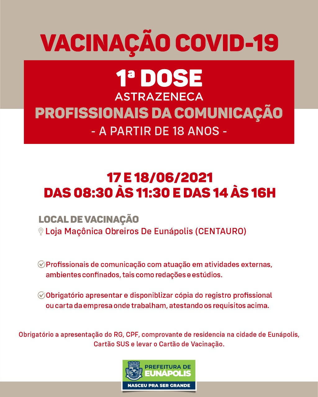 Nos dias 17 e 18/06 [quinta e sexta-feira] inicia a vacinação para os profissionais da comunicação a partir de 18 anos.