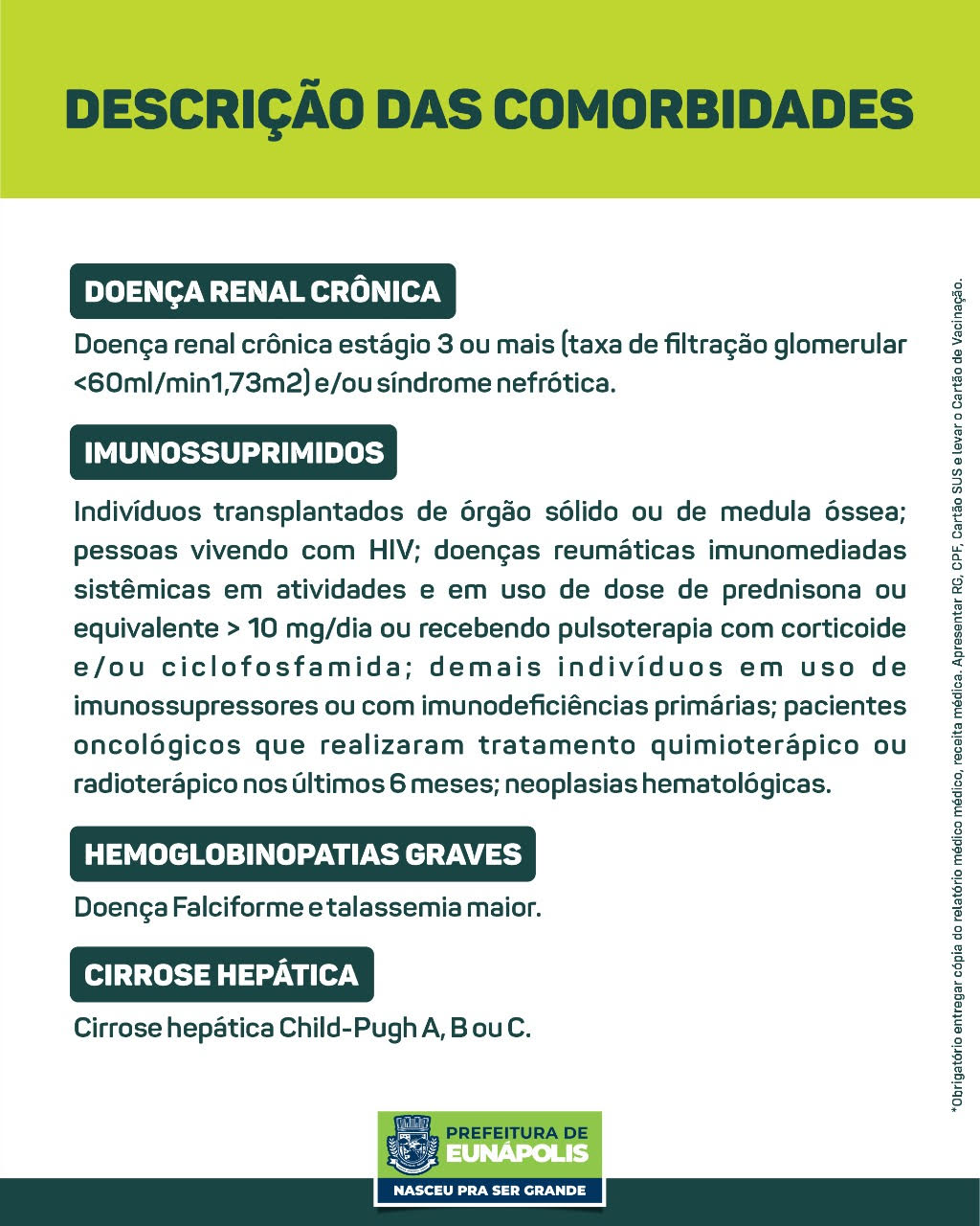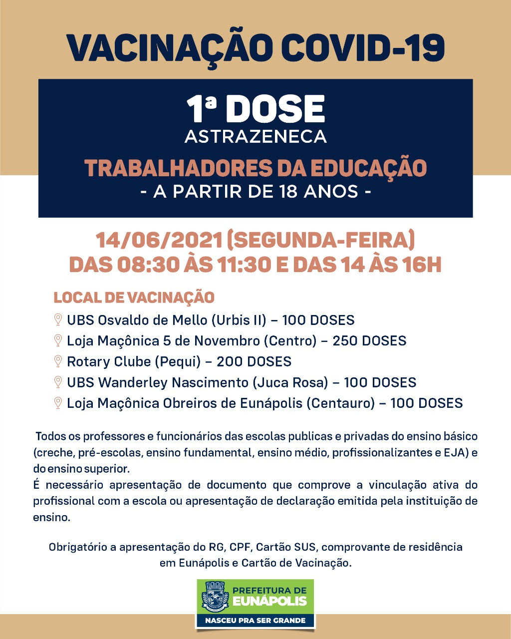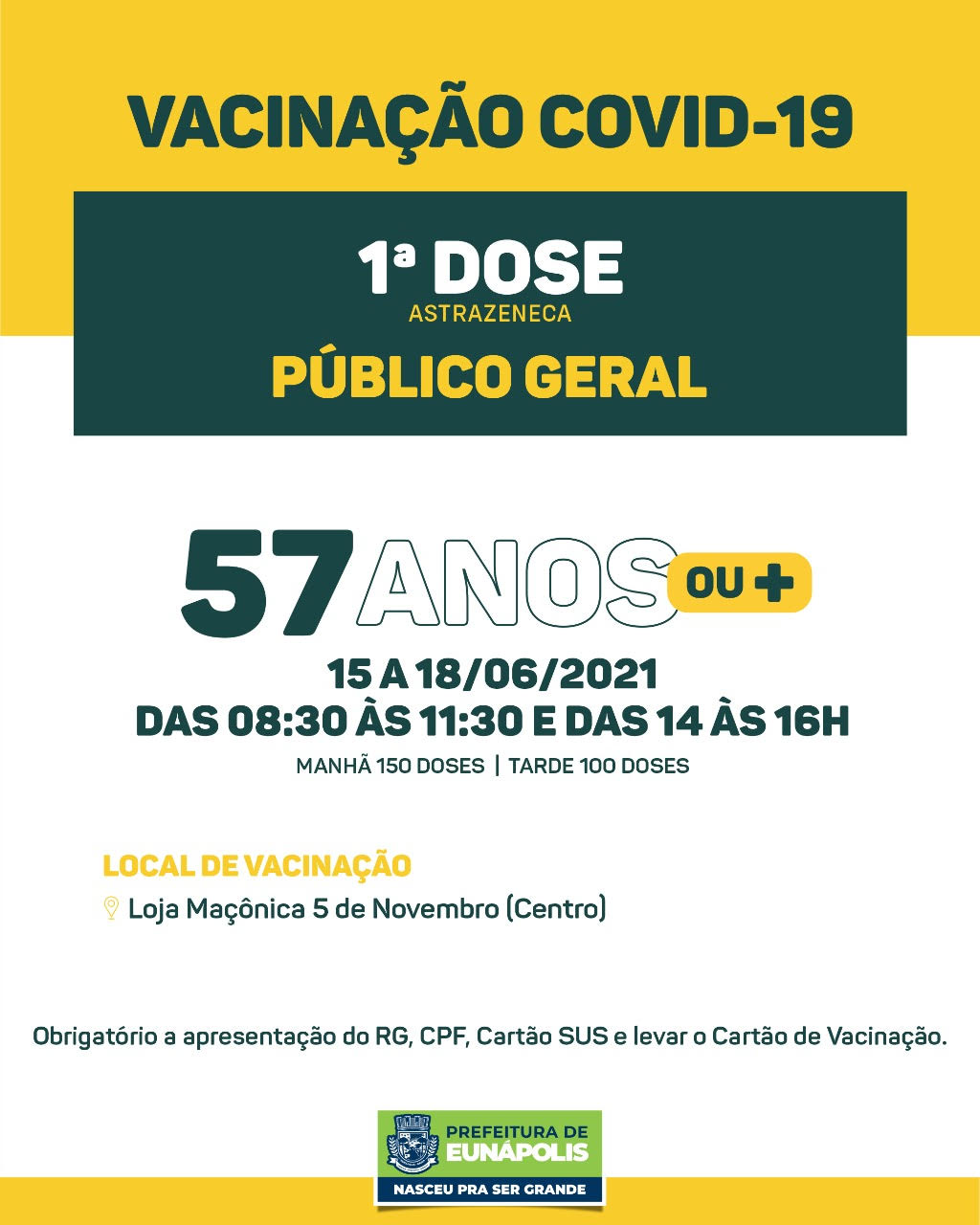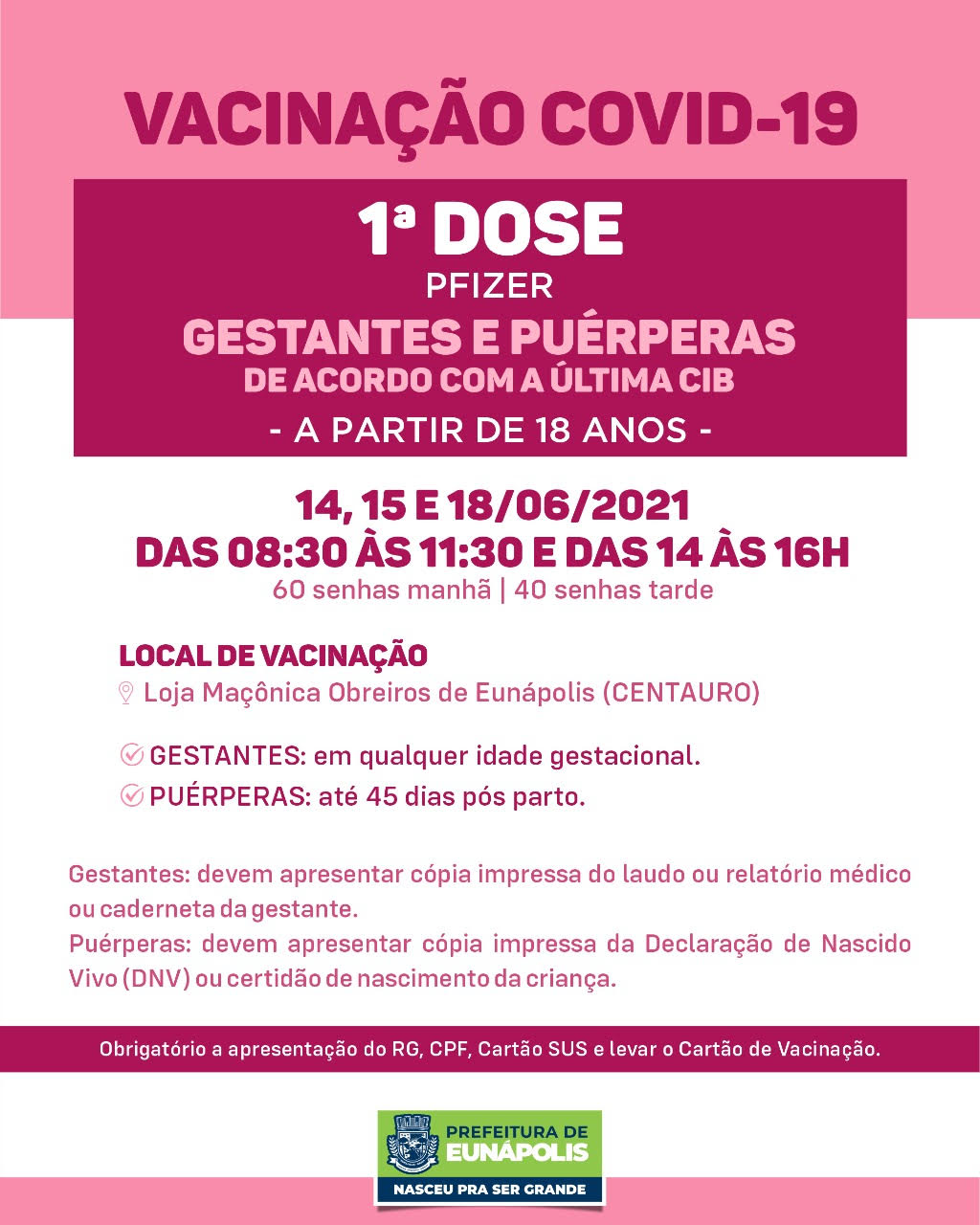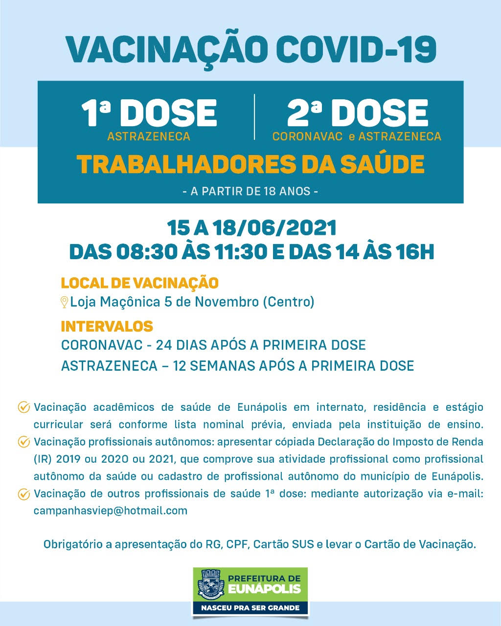 ⚠️ ATENÇÃO: Levar documento de identificação com foto, comprovante de residência na cidade de Eunápolis, carteira de vacina, CPF e cartão SUS.