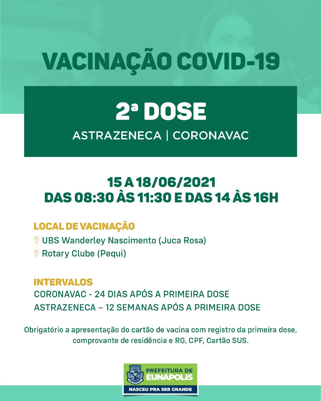 Nos dias 15, 16, 17 e 18/06, [terça, quarta, quinta e sexta-feira], continuam a imunização com a 2ª dose da vacina contra a Covid-19.