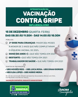 Das 8h30 às 11h30 e das 14h às 16h30, a vacinação contra a Influenza H1N1 (gripe) acontece nas unidades de saúde dos bairros Cajueiro, Moisés Reis, Juca Rosa, Dinah Borges e Centauro. O público-alvo são crianças maiores de seis meses e menores de dois anos; idosos acima dos 60 anos; gestantes; e trabalhadores da saúde.