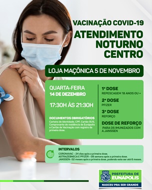 A Secretaria de Saúde de Eunápolis disponibiliza nesta quarta-feira, dia 15, intensificação na oferta de vacinação, com o objetivo de prevenir doenças e promover saúde para a população eunapolitana. Há disponibilização de imunização contra a Influenza H1N1 (gripe) e atendimento noturno para a vacinação contra a Covid-19.