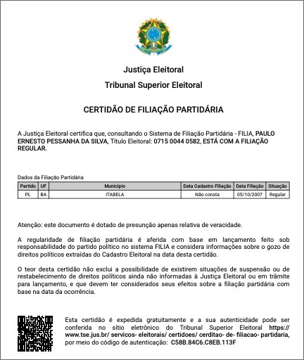 Regular Atenção: este documento é dotado de presunção apenas relativa de veracidade. A regularidade de filiação partidária é aferida com base em lançamento feito sob responsabilidade do partido político no sistema FILIA e considera informações sobre o gozo de direitos políticos extraídas do Cadastro Eleitoral na data desta certidão.