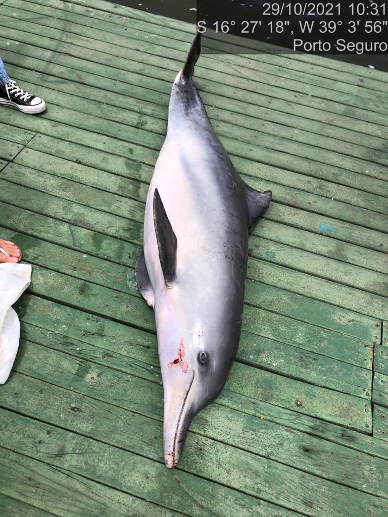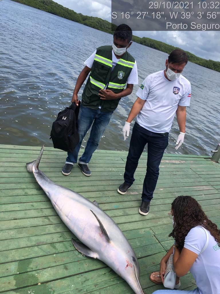 Um golfinho foi recolhido no Rio Buranhém, por fiscais ambientais da Secretaria Municipal de Meio Ambiente e Causa Animal, após acionados por morador local, informando sobre o mamífero que estava morto e boiando próximo às balsas, nesta sexta-feira (29/10).