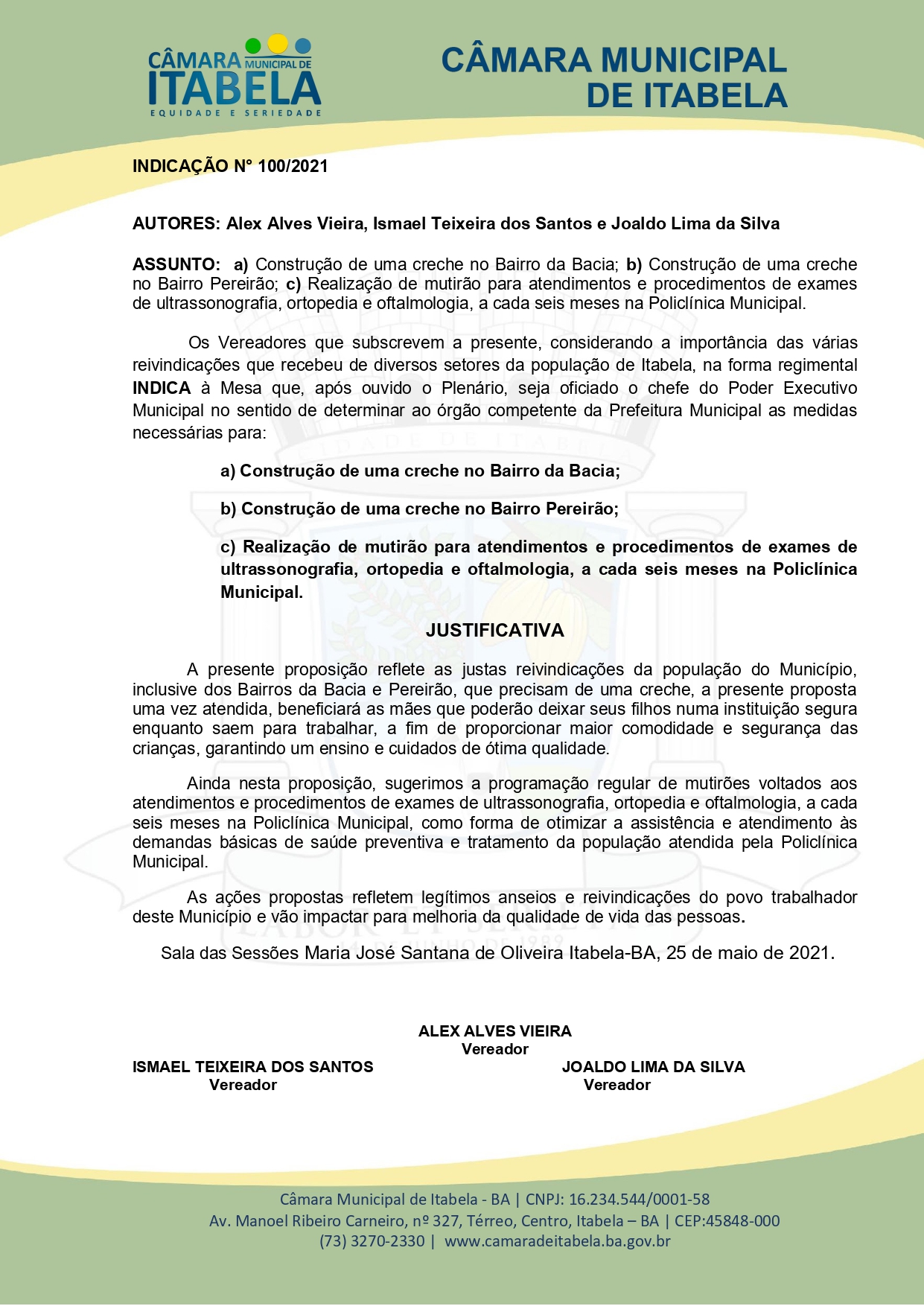 Na proposição dos parlamentares N° 100/2021 justificam a construção das creches atendendo uma antiga reivindicação dos moradores do município, em especial dos bairros da Bacia e Pereirão. Uma grande quantidade de mães com filhos que precisam sair para trabalhar e ter a certeza que suas crianças estarão em segurança, além de proporcionar ensino de qualidade.