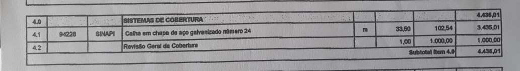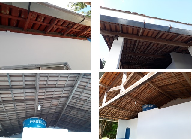 Na oportunidade podemos verificar que houve a revisão em todo o telhado da unidade escolar e a calha em chapa de aço galvanizado que custou R$ 3.435,01  encontra-se no local, porém não foram utilizados 33,5 m como anunciado na planilha e sim aproximadamente 13 m, outra coisa que chama atenção é o valor pago por cada metro, R$102,54.