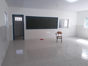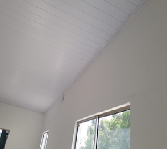 Seguindo analisando a mesma imagem acima, não encontramos em nenhum lugar da unidade escolar 1 cm sequer de peitoril em granito seja de qualquer cor, mas na planilha acusa a compra e a utilização de 15,10 m de peitoril em granito cinza com as seguintes medidas L=15cm e E=2cm, ou seja, custaram R$ 1.346,17, porém foi constatado que não foram instalados. Ainda sobre a imagem acima que informa que que foi comprado 77,06 metros quadrados de GESSO para o forro e custaram R$ 3.021,72 do valor da obra, para nossa surpresa o que encontramos foi a sala forrada em PVC como está nas imagens abaixo.