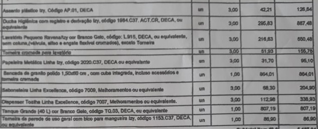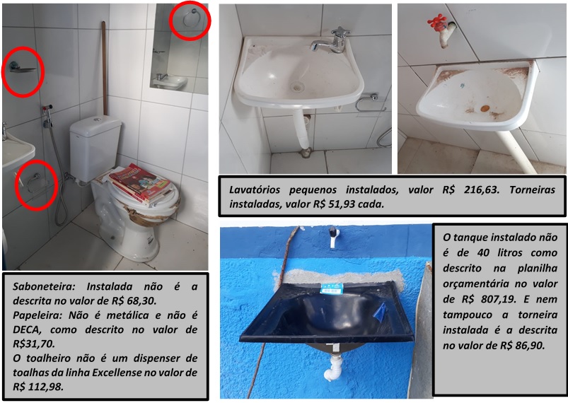 Foram instalados vasos sanitários nos banheiros masculino e feminino, duchas higiênicas, saboneteiras, toalheiras e suporte para papel higiênico. O que nos chama a atenção é que a qualidade dos que estão instalados não bate com aquilo que foi descrito na planilha, veja as fotos.