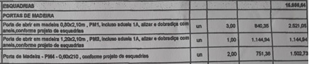 Denunciamos em uma reportagem anterior o elevado custo das portas simples de madeira, vejam o preço nessa tira da planilha orçamentária para a reforma da Escola David Ramos Motta.