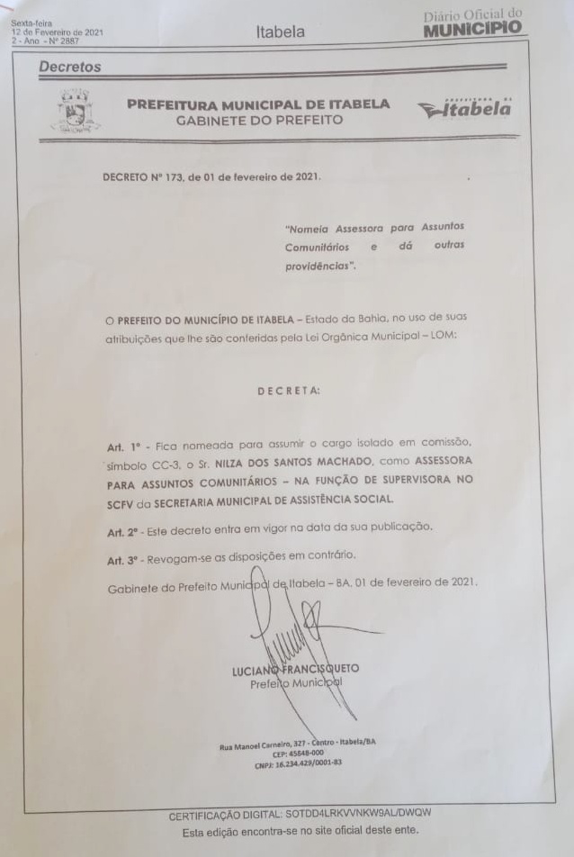 A denúncia formulada contra o Presidente da Câmara de Itabela, se deu pela nomeação de sua esposa, Nilza dos Santos Machado, para o cargo de Assessora para Assuntos Comunitário, na Função de Supervisora no SCFV na Secretaria de Assistência Social.