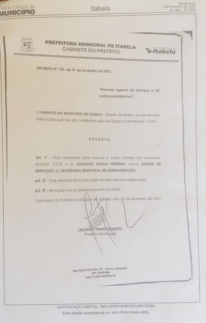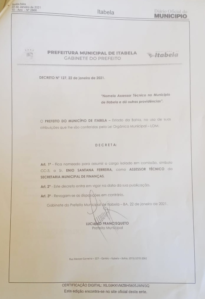 Maria Vânia Costa Santana Ferreira, (Vereadora), nomeação de seu filho,Enio Santana Ferreira;