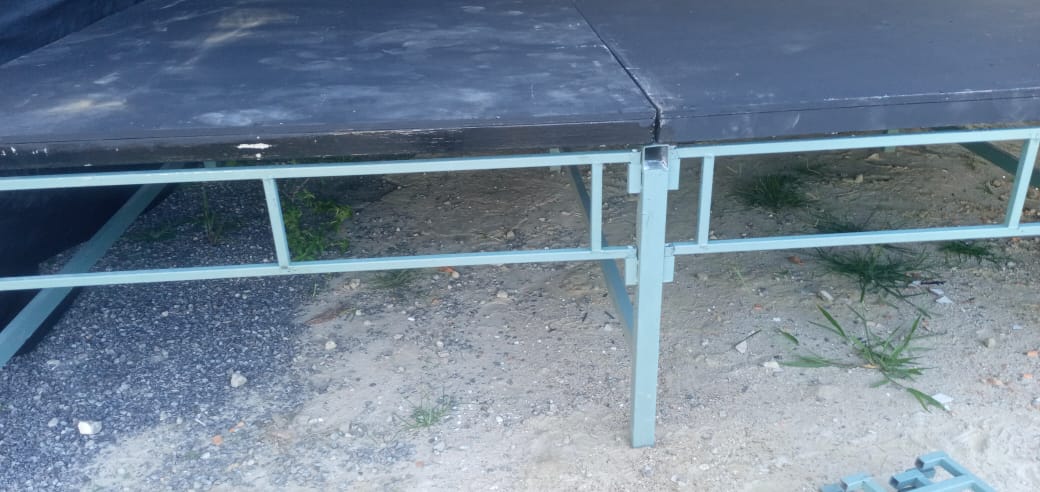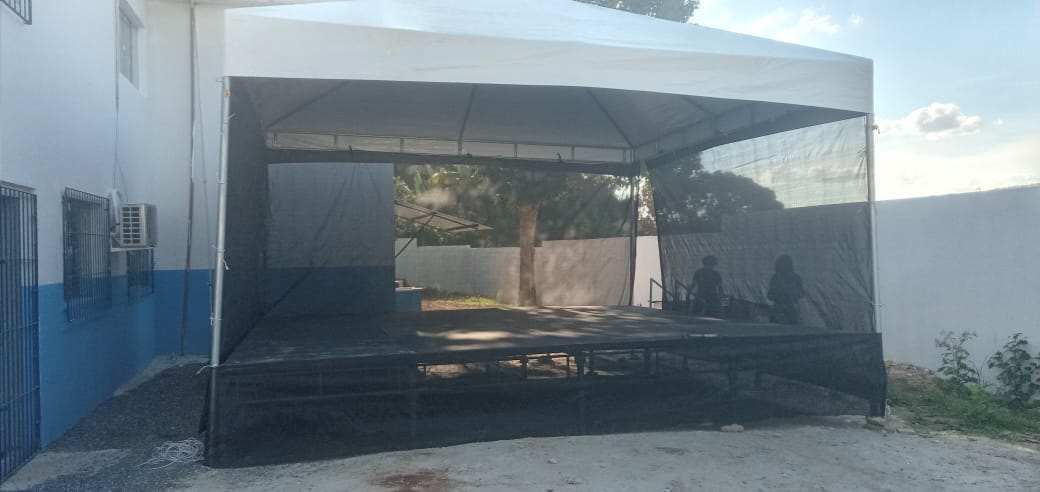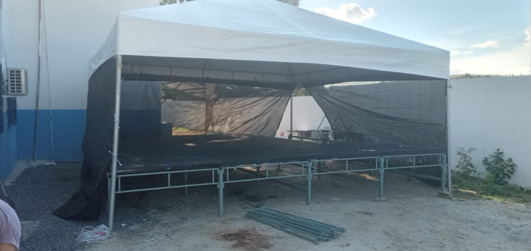 O palco/palanque comprado com recurso da Lei Aldir Blanc, medindo 06×06, com 6 metros de profundidade; mt Pé direito 8 mt, com cobertura em Box truss P 30 (GALVANIZADO) forma de duas águas, piso do palco em estrutura metálica com placas de ferro chapo 14 com compensado naval de 20mm revestido em carpete da cor do tema, cobertura com lona na cor branca, anti chamas, fechado com telas laterais em sombrite preto de 80%, altura do solo de no mínimo l,20m e no Maximo até 2,00m, para corpo de 01,00 1 mt de altura a partir do piso em todos os laterais, escoado de acesso com corrimão dentro dos normas do ABNT.