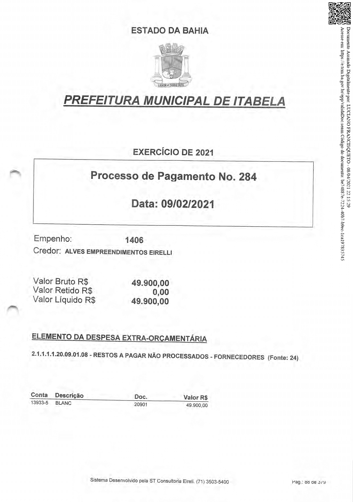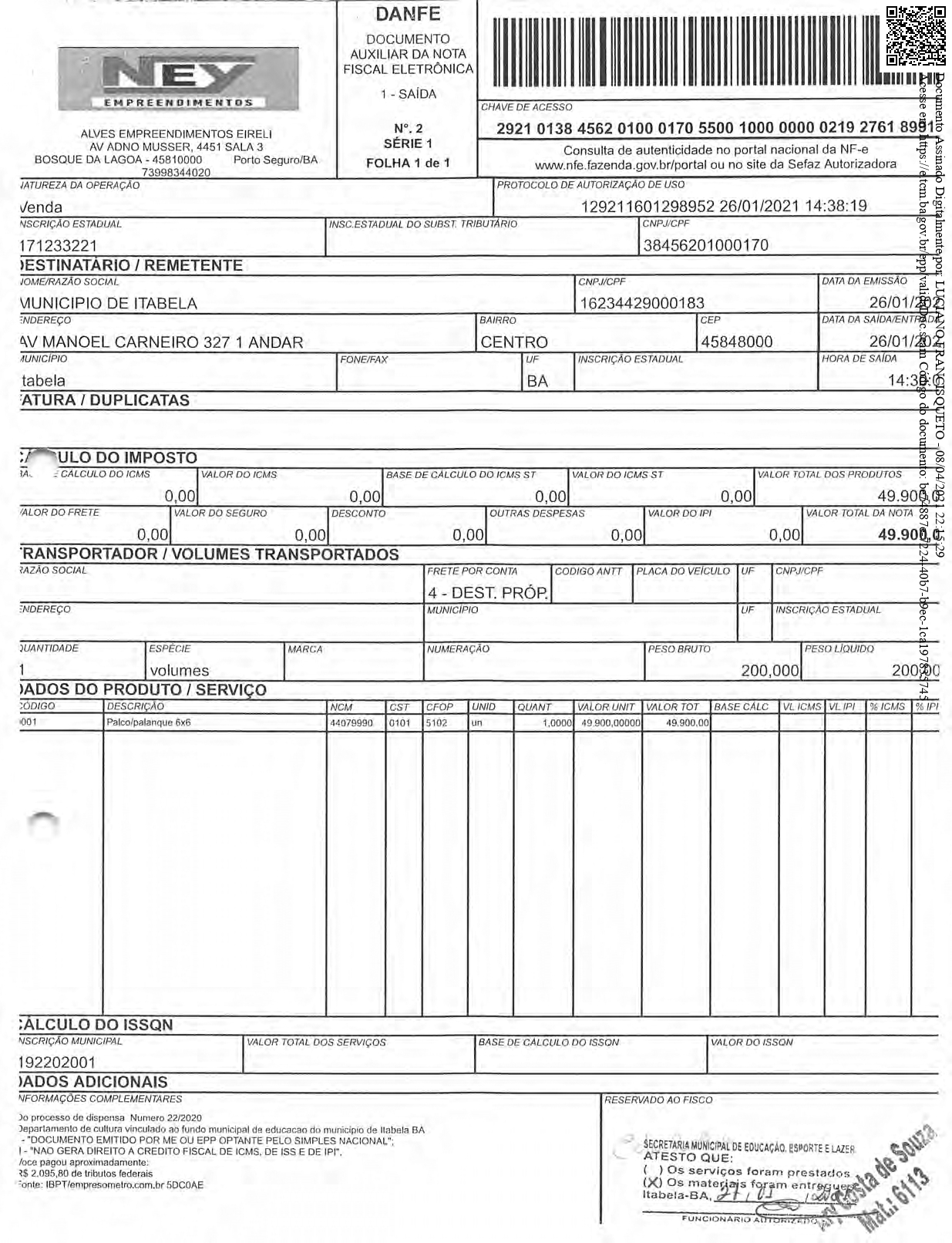 Conforme consta no processo de pagamento no. 277 de 08/02/2021, a prefeitura pagou a empresa l Florêncio dos Santos o valor R$ 49.900,00 na aquisição do palco/palanque, para o departamento de cultura vinculado ao fundo municipal de educação do município de Itabela/BA,