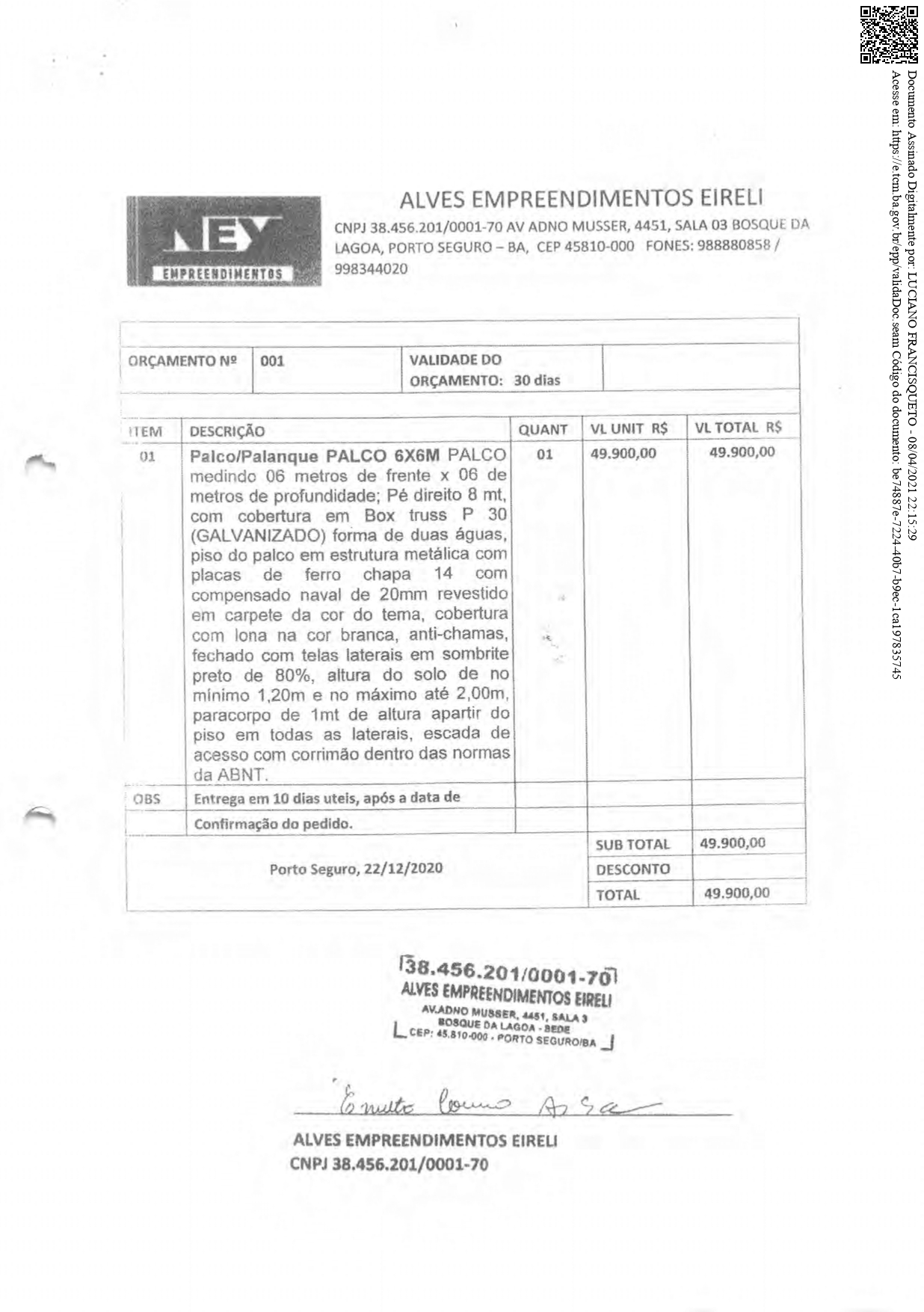 Outra observação, a princípio, o material do palco apresentado, não confere com os materiais descritos no contrato firmado entre a empresa L Florêncio dos Santos e a prefeitura municipal de Itabela. Houve também a contratação da empresa Alves Empreendimentos Eirelli, com endereço na Avenida Adno Musser n° 4451, CNPJ Nº 38.456.201/0001-70, com endereço no Bairro, Bosque da Lagoa, em Porto Seguro/BA, no valor global de R$ 49.900,000. O pagamento foi efetuado no dia, 09/02/2021, conforme o artigo 2″, Inciso III, da lei Aldir Blanc que permiti a utilização dos recursos advindos desta Lei para aquisição de bens e serviços vinculados ao setor cultural. Como consta em documento, os equipamentos de som foram pagos e entregues em janeiro de 2021 e recebido pela Coordenadora de Atividades Internas, Ediléia da Penha Vedramini.