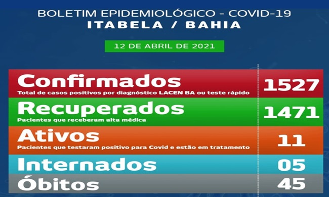 O boletim divulgado mostra que a estatística da secretaria de saúde no combate a doença tem dado certo no município. Até esta data Itabela teve um total de 1.527 casos. Recuperados 1.471; ativos 11 casos; internados 5 e mortes em decorrência da doença, somam 45 óbitos.