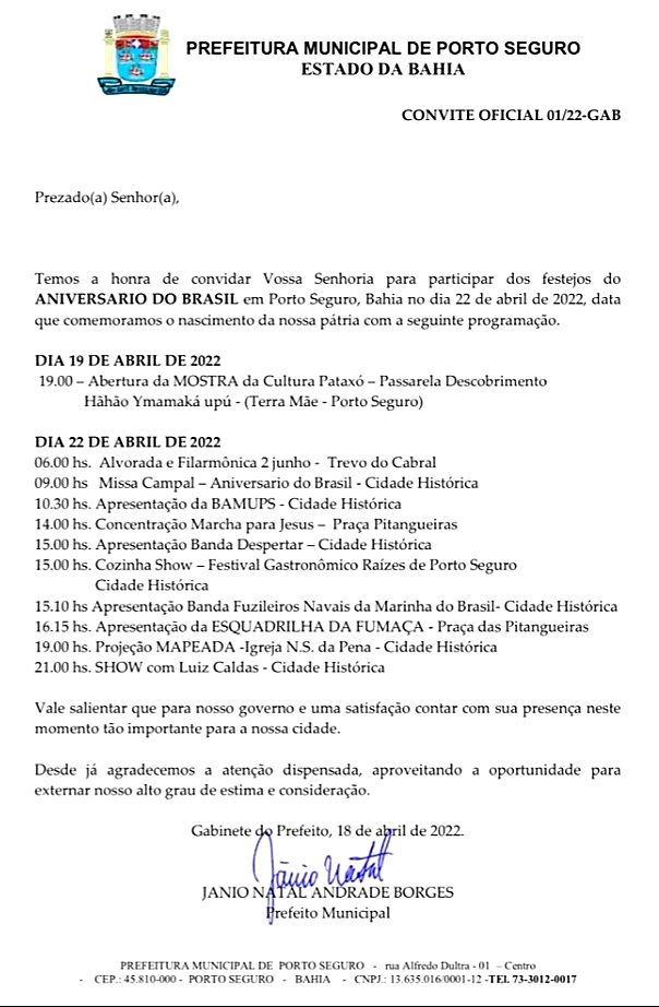 O prefeito de Porto Seguro, Jânio Natal convoca a população em geral para a comemoração dos 522 anos do Brasil.