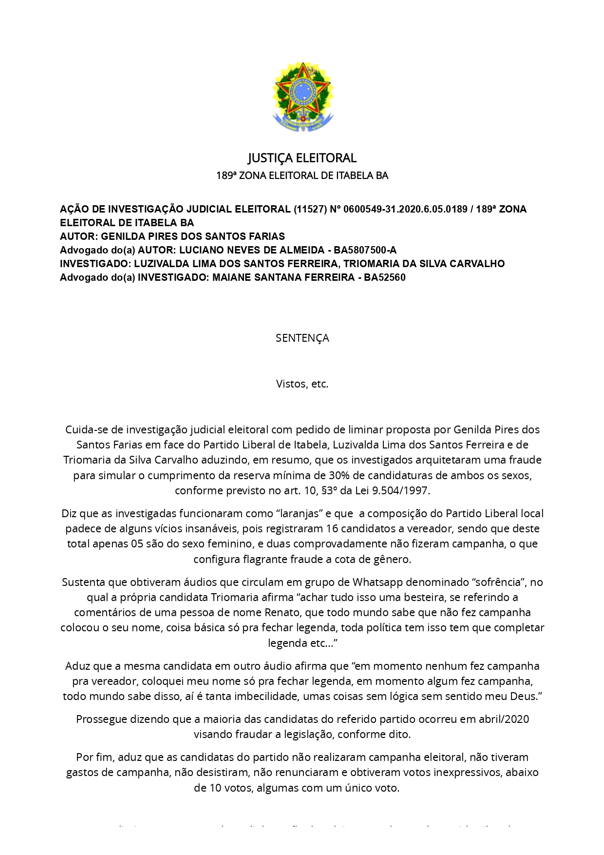A ação foi movida pela candidata Genilda Pires dos Santos Farias, a qual alegava suposta fraude por cota de gêneros e pedia a cassação dos registros e diplomas de todos os candidatos do partido PL.