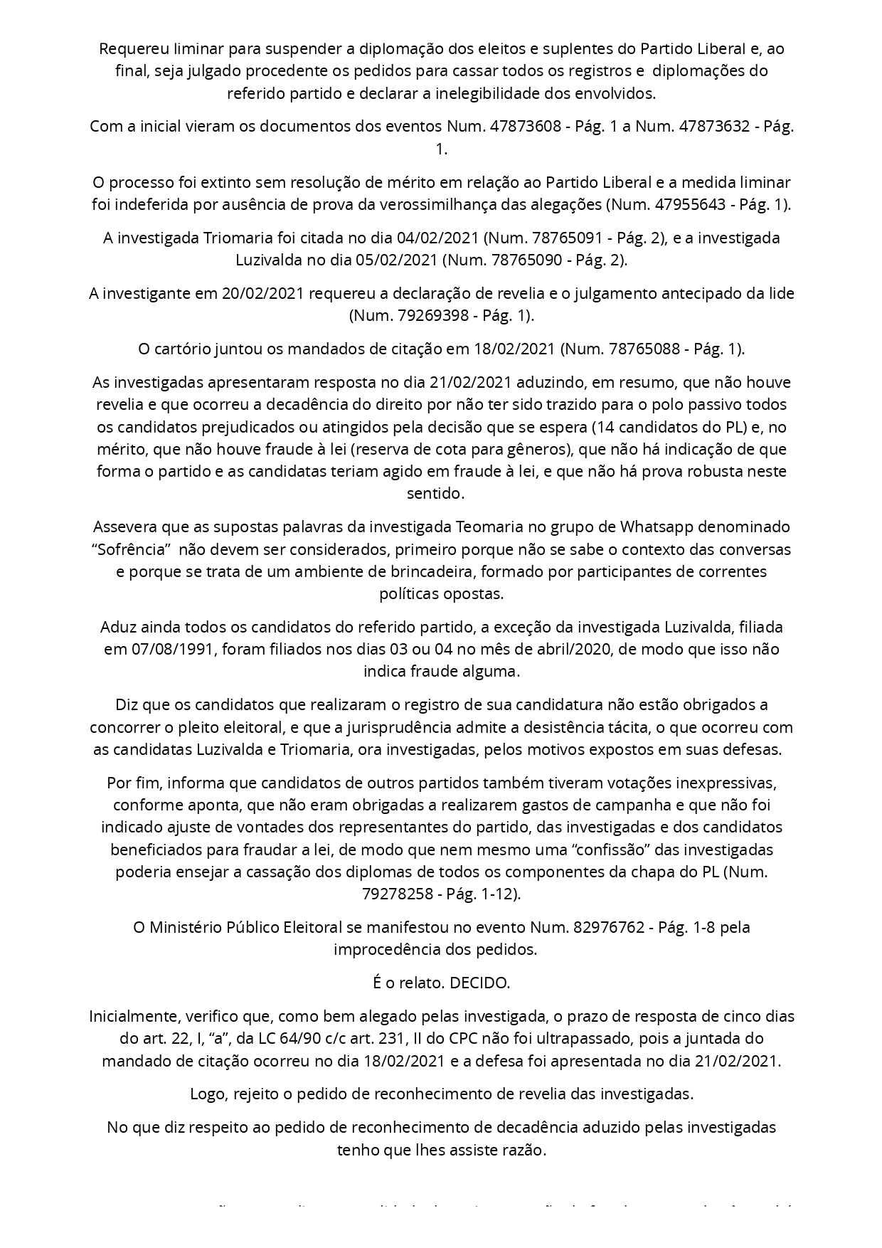 Na defesa, as investigadas Luzivalda Lima dos Santos Ferreira e de Triomaria da Silva Carvalho alegaram, em síntese, que ocorreu a decadência do direito por não ter sido trazido para o polo passivo todos os candidatos do partido PL, os quais poderiam ser prejudicados caso a ação fosse julgada procedente. Alegaram, ainda, que não há indicação de que forma o partido e as candidatas teriam agido em fraude à lei, e que não há prova robusta neste sentido.