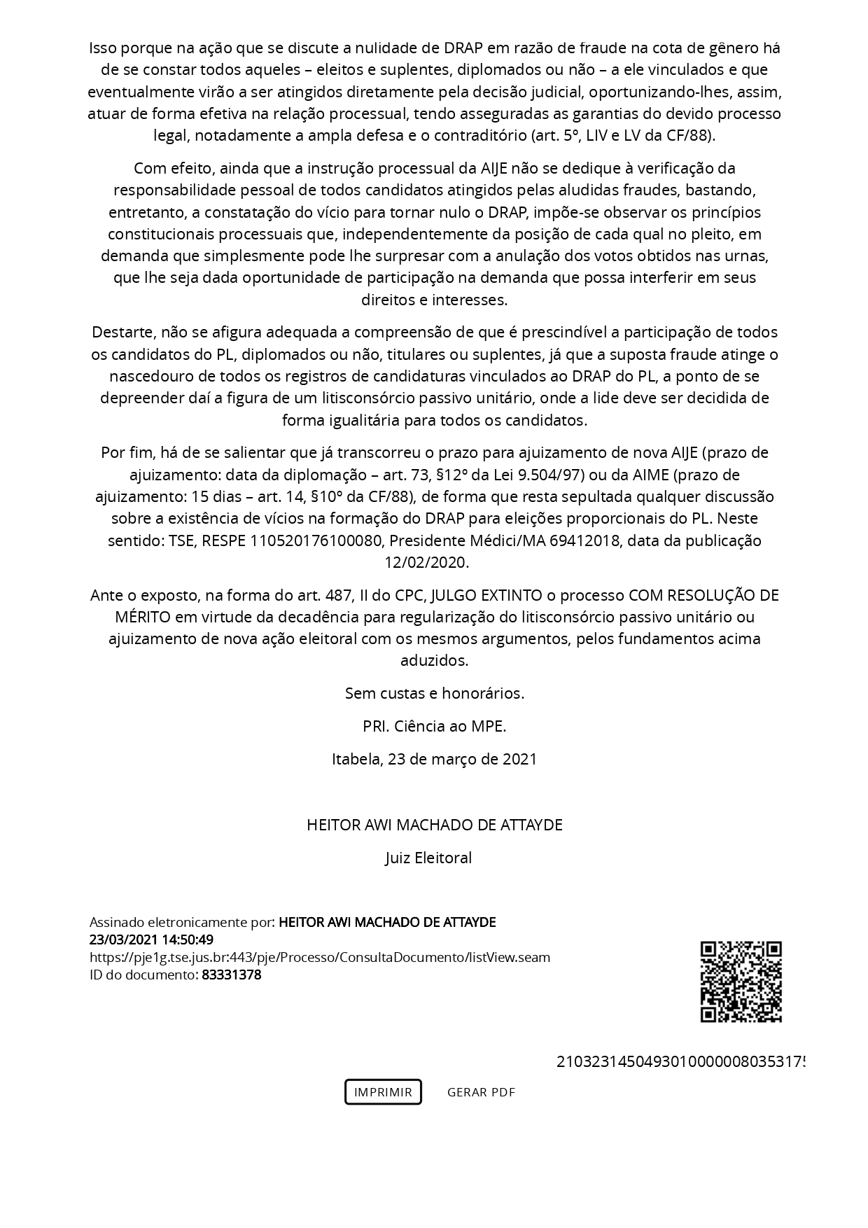 Na decisão, o juiz da 189ª Zona Eleitoral, Dr. Heitor Awi Machado de Attayde, julgou extinta a ação com resolução do mérito em virtude da decadência para regularização do litisconsórcio passivo unitário ou ajuizamento de nova ação eleitoral com os mesmos argumentos.