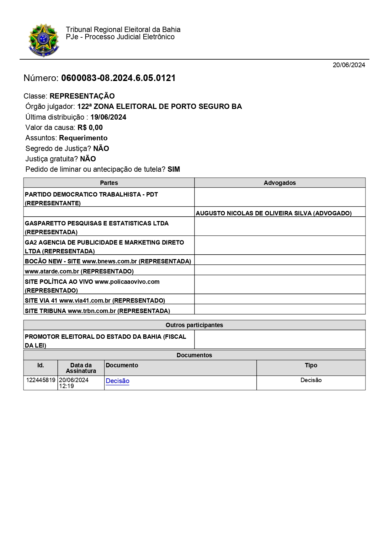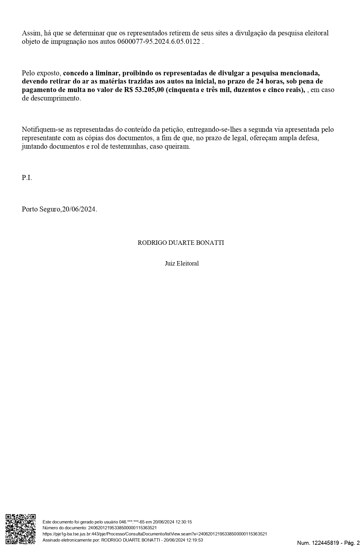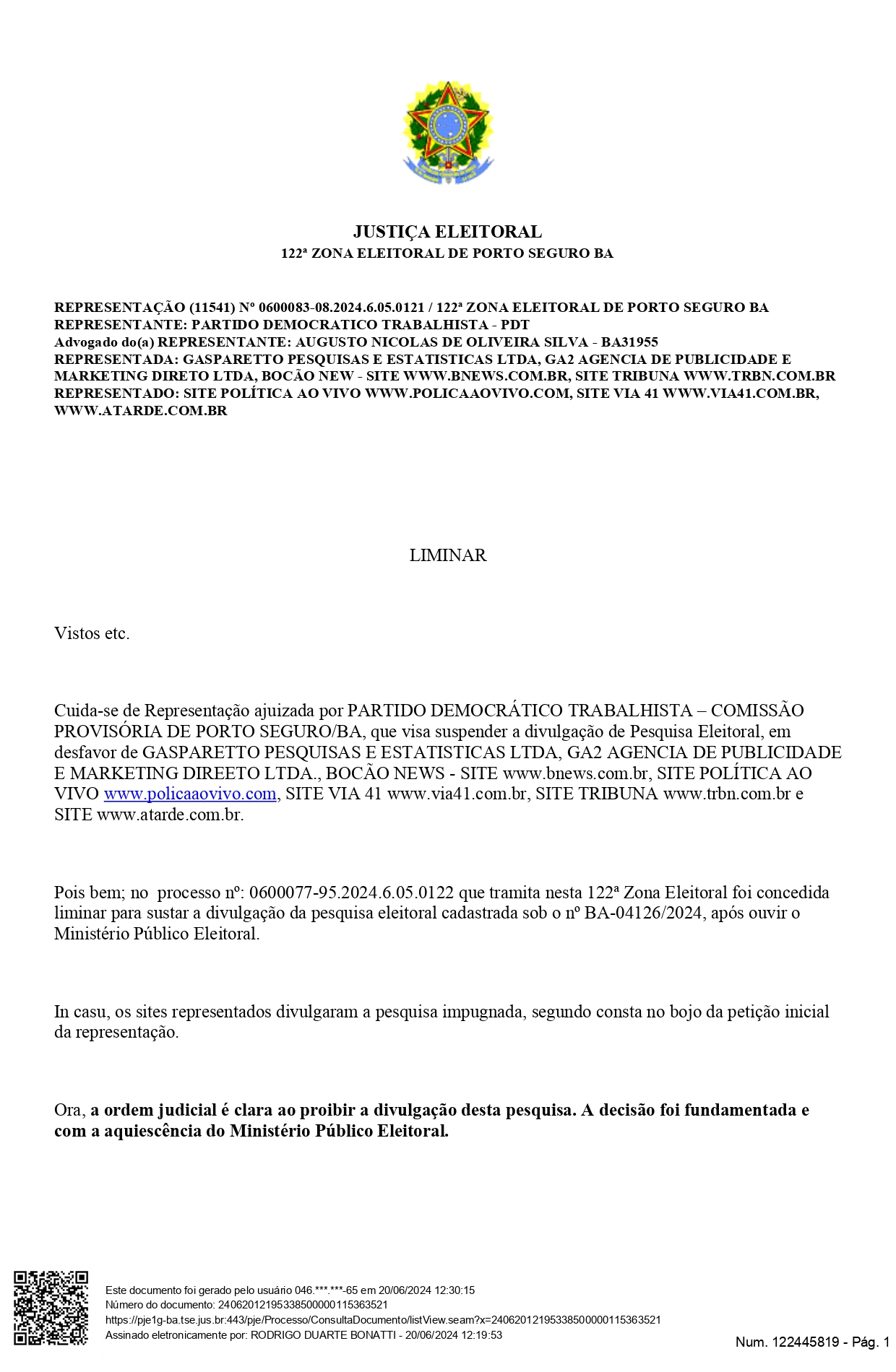 Decisão proferida pela 122ª Zona Eleitoral de Porto Seguro determinou a suspensão imediata da divulgação de uma pesquisa eleitoral irregular. A medida vale para todos os sites e portais de notícias que a haviam publicado.