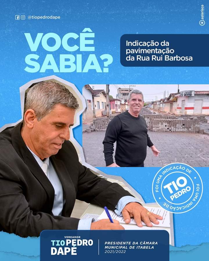 Reconhecido por seus pares como hábil articulador político e um dos responsáveis pelo progresso e a transformação que o município vem passando, com a realização de importantes obras de infraestrutura nos quatro cantos da cidade, o Presidente da Câmara Municipal de Itabela, o vereador Pedro Antônio Ribeiro da Silva, mais conhecido como Tio Pedro Dapé, tem se notabilizado como uma destacada figura pública no cenário municipal.