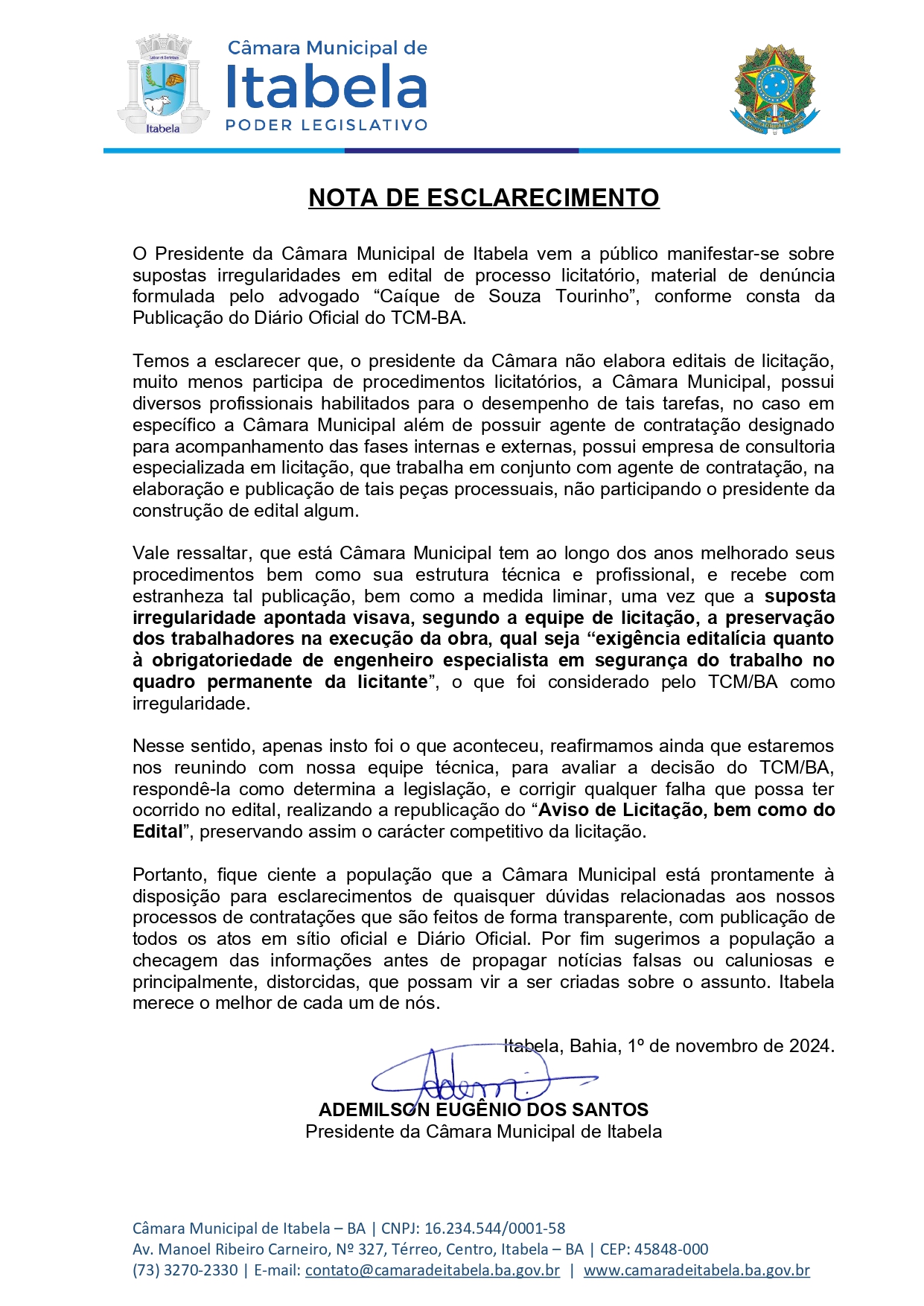 Nesta sexta-feira, o presidente da Câmara de Vereadores de Itabela, Lukinho Eugênio (Republicanos/BA), emitiu uma nota de esclarecimento para desmistificar rumores sobre supostas irregularidades em um edital de licitação, alvo de questionamentos feitos pelo advogado Caíque de Souza Tourinho e divulgados no Diário Oficial do Tribunal de Contas dos Municípios da Bahia (TCM-BA). Em resposta, Lukinho Eugênio reitera o compromisso da Câmara com a transparência e a legalidade de seus processos, buscando deixar claro o papel e a responsabilidade de cada setor envolvido nas atividades licitatórias.