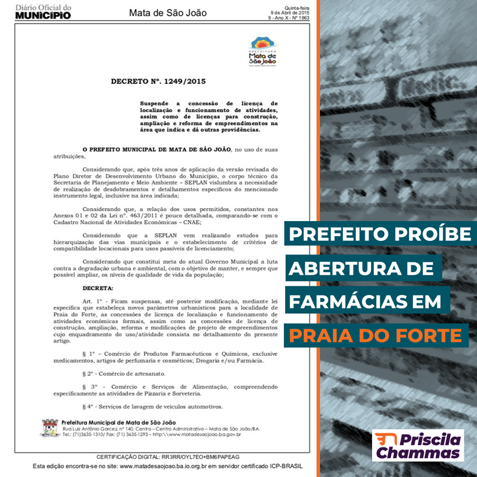É isso mesmo, o prefeito de Mata de São João, Marcelo Oliveira (PSDB), baixou um decreto há três anos, vedando a concessão de licenças para farmácias até que se tenha uma regulamentação específica para o setor, coisa que não aconteceu nesse longo período de tempo.