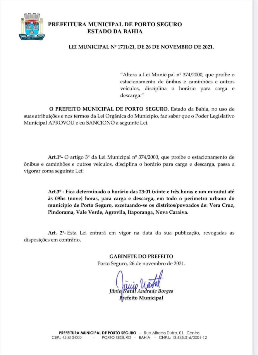 O prefeito argumentou ainda que a mudança do horário de carga e descarga é uma reivindicação antiga de comerciantes e consumidores. “Toda mudança que vem para melhorar precisa do entendimento e colaboração de todos. Porto Seguro é uma cidade histórica, com vias estreitas e que precisa de adaptações para fluir bem”, disse Jânio Natal, completando que está reforçando as equipes de agentes e monitores de trânsito.