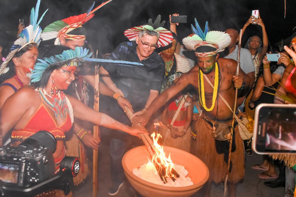 Caciques, anciãos, crianças e jovens indígenas das aldeias Mirapé, Novos Guerreiros e Itapororoca recepcionaram o prefeito, Jânio Natal, e sua comitiva de secretários e vereadores, com awê coletivo e cerimônia do fogo ‘Jompek Naó’, que significa a ancestralidade e a importância do fogo nesta cultura. O ponto alto da cerimônia foi o ato de acender a chama olímpica dos Jogos Indígenas 2023, conforme garantiu o prefeito, Jânio Natal, em retomar todas ações de valorização da cultura indígena na cidade.